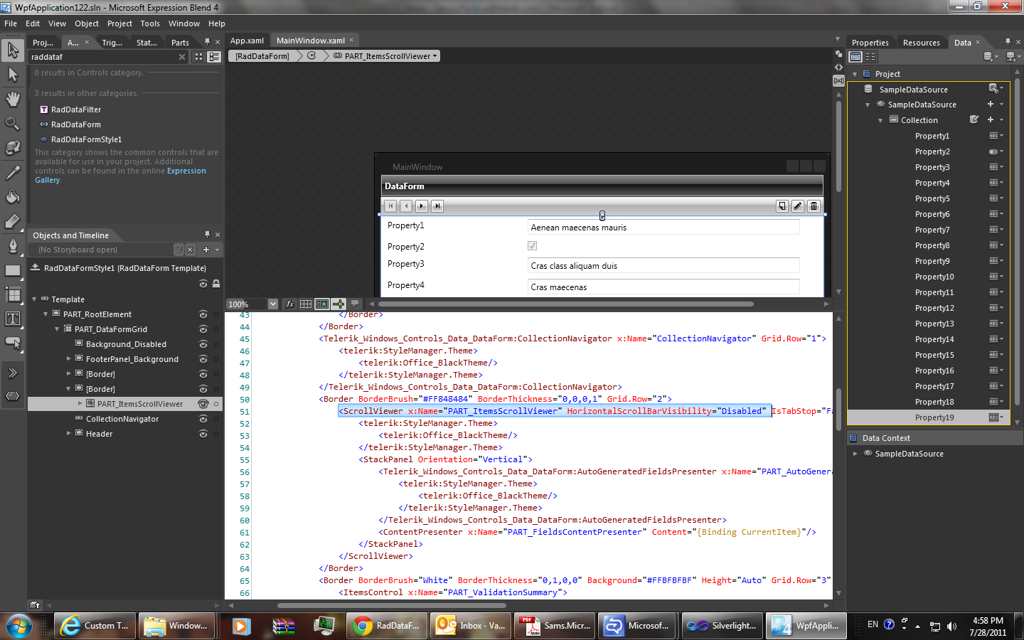 <telerik:RadDataForm x:Name="PartForm" AutoGenerateFields="False" CurrentItem="Model" EditTemplate="{StaticResource PartFormTemplate}" Header="{Binding Model.PartNumber}" NewItemTemplate="{StaticResource PartFormTemplate}" ReadOnlyTemplate="{StaticResource PartFormTemplate}" ScrollViewer.CanContentScroll="False" />...(note the ScrollViewer.CanContentScroll="False") and it does absolutely nothing. My LoB form has a grid which, among other things, includes two columns - one with a fixed width and the other with a starred width. The starred width column includes a TextBlock where wrapping has been enabled. I need RadDataForm to allow for disabling the horizontal scrolling so that the text actually wraps.