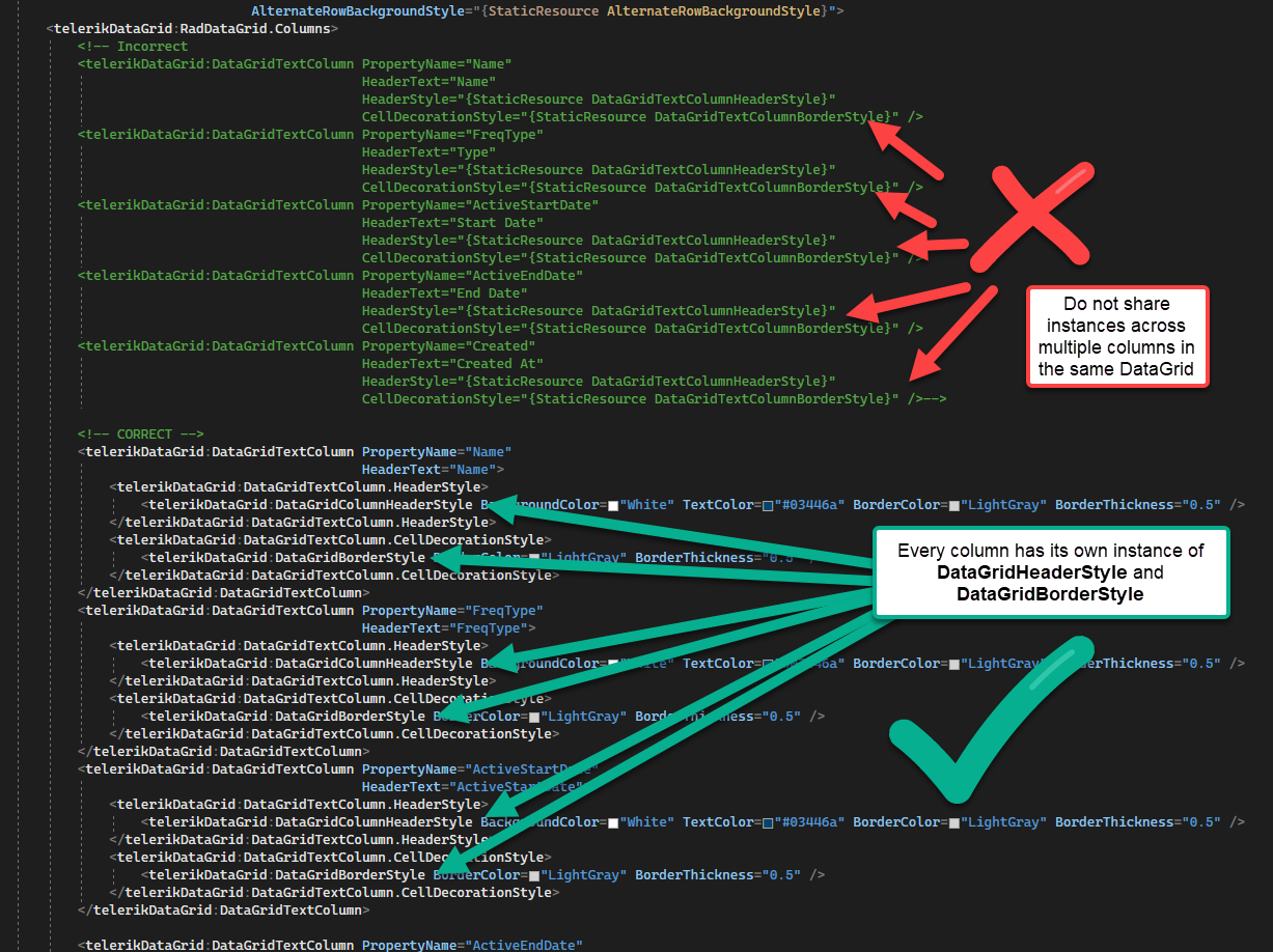 Why does this matter? In XAML, a Style is essentially a "definition" of what values to use in the target object, it is not an instance of that end object. Whereas a DataGridBorderStyle is an instance of a DataGridBorderStyle object and is not a template that can be reused.