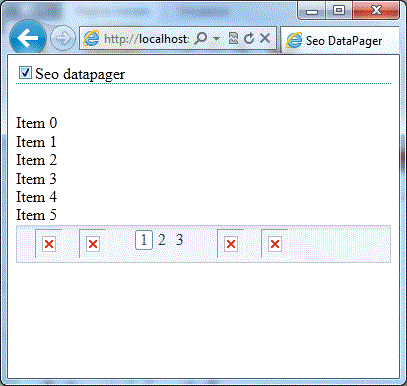 <telerik:RadListView ID="RadListView1" runat="server" OnNeedDataSource="RadListView1_NeedDataSource" AllowPaging="True" ItemPlaceholderID="Panel1" > <LayoutTemplate> <asp:Panel ID="Panel1" runat="server" /> <div> <telerik:RadDataPager ID="RadDataPager1" runat="server" PagedControlID="RadListView1" PageSize="6" SEOPagingQueryPageKey="page" AllowSEOPaging="True"> <Fields> <telerik:RadDataPagerButtonField FieldType="FirstPrev" /> <telerik:RadDataPagerButtonField FieldType="Numeric" PageButtonCount="5" /> <telerik:RadDataPagerButtonField FieldType="NextLast" /> </Fields> </telerik:RadDataPager> </div> </LayoutTemplate> <ItemTemplate> <div> <%#Container.DataItem%> </div> </ItemTemplate> </telerik:RadListView>7 Answers, 1 is accepted