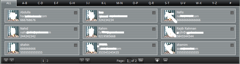 <%@ Page Language="C#" ValidateRequest="false" EnableEventValidation="false" CodeBehind="UIPeople.aspx.cs" Inherits="myDoxii_WebRole.UIPeople" %> <%@ Register Assembly="Telerik.Web.UI" Namespace="Telerik.Web.UI" TagPrefix="telerik" %> <!DOCTYPE html PUBLIC "-//W3C//DTD XHTML 1.0 Transitional//EN" "http://www.w3.org/TR/xhtml1/DTD/xhtml1-transitional.dtd"> <html xmlns="http://www.w3.org/1999/xhtml"> <head runat="server"> <title></title> <link href="App_Themes/CustomTabStrip/TabStrip.CustomTabStrip.css" rel="stylesheet" type="text/css" /> <link href="StyleSheet/MainStylesheet.css" rel="stylesheet" type="text/css" /> <link href="App_Themes/ForestBlack/TabStrip.ForestBlack.css" rel="stylesheet" type="text/css" /> <link href="App_Themes/CustomTabStripOffice2007/TabStrip.CustomTabStripOffice2007.css" rel="stylesheet" type="text/css" /> </head> <body style="background-color: Transparent;"> <form id="form1" method="post" runat="server"> <telerik:RadScriptManager ID="RadScriptManager1" runat="server"> </telerik:RadScriptManager> <telerik:RadAjaxManager ID="RadAjaxManager1" runat="server"> <AjaxSettings> <telerik:AjaxSetting AjaxControlID="ListViewPanel1"> <UpdatedControls> <telerik:AjaxUpdatedControl ControlID="ListViewPanel1" LoadingPanelID="RadAjaxLoadingPanel1" /> </UpdatedControls> </telerik:AjaxSetting> </AjaxSettings> </telerik:RadAjaxManager> <%--<telerik:RadAjaxLoadingPanel ID="RadAjaxLoadingPanel2" runat="server" MinDisplayTime="0" />--%> <%-- <asp:UpdatePanel ID="UpdatePanel1" runat="server"> </asp:UpdatePanel>--%> <telerik:RadFormDecorator ID="RadFormDecorator1" runat="server" Skin="Black" EnableRoundedCorners="true" /> <telerik:RadAjaxPanel ID="RadAjaxPanel1" runat="server" Height="100%" Width="100%" HorizontalAlign="NotSet" LoadingPanelID="RadAjaxLoadingPanel1"> <div class="MainContent"> <%-- <div id="ContactHeaderImage"> <div id="ContactHeaderImageMiddle"> <asp:Label ID="lblContactHeader" runat="server" Text="Contact" CssClass="cssContentHeader"></asp:Label> </div> <div id="ContactHeaderImageSearch"> </div> </div>--%> <div id="Contact_ListsMain"> <fieldset class="flsContactListAll" style="float: left; width: 980px; min-height: 60px; padding-bottom: 0px; padding-left: 7px; border: 0px;"> <telerik:RadTabStrip ID="RadTabStripContactList" runat="server" SelectedIndex="13" Skin="CustomTabStripOffice2007" EnableEmbeddedSkins="False" Width="980px" Font-Size="10pt" OnTabClick="RadTabStripContactList_TabClick"> <Tabs> <telerik:RadTab runat="server" Text="ALL" Width="65.3px" Selected="True"> </telerik:RadTab> <telerik:RadTab runat="server" Text="A-B" Width="65.3px"> </telerik:RadTab> <telerik:RadTab runat="server" Text="C-D" Width="65.3px"> </telerik:RadTab> <telerik:RadTab runat="server" Text="E-F" Width="65.3px"> </telerik:RadTab> <telerik:RadTab runat="server" Text="G-H" Width="65.3px"> </telerik:RadTab> <telerik:RadTab runat="server" Text="I-J" Width="65.3px"> </telerik:RadTab> <telerik:RadTab runat="server" Text="K-L" Width="65.3px"> </telerik:RadTab> <telerik:RadTab runat="server" Text="M-N" Width="65.3px"> </telerik:RadTab> <telerik:RadTab runat="server" Text="O-P" Width="65.3px"> </telerik:RadTab> <telerik:RadTab runat="server" Text="Q-R" Width="65.3px"> </telerik:RadTab> <telerik:RadTab runat="server" Text="S-T" Width="65.3px"> </telerik:RadTab> <telerik:RadTab runat="server" Text="U-V" Width="65.3px"> </telerik:RadTab> <telerik:RadTab runat="server" Text="W-X" Width="65.3px"> </telerik:RadTab> <telerik:RadTab runat="server" Text="Y-Z" Width="65.3px"> </telerik:RadTab> <telerik:RadTab runat="server" Text="#" Width="65.3px"> </telerik:RadTab> </Tabs> </telerik:RadTabStrip> <div class="ContactListView"> <asp:Panel ID="ListViewPanel1" runat="server"> <telerik:RadListView ID="rlstvContactSummary" runat="server" ItemPlaceholderID="ListViewContainer" AllowPaging="True" PageSize="9" Skin="Black" OnSelectedIndexChanged="rlstvContactSummary_SelectedIndexChanged" DataKeyNames="Contact_ID"> <LayoutTemplate> <asp:Panel ID="ListViewContainer" runat="server" /> <table cellpadding="0" cellspacing="0" width="980px;" style="float: left; margin-left: -1px; margin-top: 8px; background-color: #FFFFFF;"> <tr> <td> <telerik:RadDataPager ID="rdpContactSummary" runat="server" PagedControlID="rlstvContactSummary" PageSize="9" Skin="Black" Width="979px" CssClass="rdpContactSummary"> <Fields> <telerik:RadDataPagerButtonField FieldType="FirstPrev" /> <telerik:RadDataPagerButtonField FieldType="Numeric" /> <telerik:RadDataPagerButtonField FieldType="NextLast" /> <telerik:RadDataPagerGoToPageField CurrentPageText="<%$ Resources:LanguageResource, rPage%>" TotalPageText="<%$ Resources:LanguageResource, rOf%>" SubmitButtonText="<%$ Resources:LanguageResource, rGo%>" TextBoxWidth="15" /> <telerik:RadDataPagerTemplatePageField> <PagerTemplate> <asp:ImageButton ID="ContactAdd" runat="server" Height="22px" Width="22px" ImageUrl="~/Images/PeopleAddBtn.png" /> <asp:ImageButton ID="ContactDelete" runat="server" Width="22px" Height="22px" ImageUrl="~/Images/PeopleDeleteBtn.png" /> </PagerTemplate> </telerik:RadDataPagerTemplatePageField> </Fields> </telerik:RadDataPager> </td> </tr> </table> </LayoutTemplate> <ItemTemplate> <fieldset class="flsContactList"> <div class="ContactListItem"> <div class="ContactListPhoto" style="width: 50px; height: 50px; float: left;"> <%--<telerik:RadBinaryImage runat="server" ID="RadBinaryImage1" DataValue='<%#Eval("[Contact_Image]") %>' AutoAdjustImageControlSize="false" Width="50px" Height="50px" ToolTip='<%#Eval("[Contact_Image]", "Photo of {0}") %>' AlternateText='<%#Eval("Contact_Image", "Photo of {0}") %>' />--%> <img alt="test Image" longdesc="Images/image.png" src="Images/User.png" style="width: 45px; height: 45px" /> </div> <div class="ContactListData" style="float: left; height: 50px; width: 100px; padding-left: 5px;"> <asp:LinkButton ID="LinkButton1" runat="server" CommandName="Select" CssClass="btnLink"> <%--<label> </label>--%> <asp:Label ID="Label1" runat="server" Visible="false" 