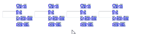 <body> <form id="form1" runat="server"> <div> <asp:ScriptManager ID="ScriptManager1" runat="server"></asp:ScriptManager> <table> <tr> <td><telerik:RadDatePicker ID="RadDatePicker1" runat="server" Width="100" Skin="CKCRadSkin" EnableEmbeddedBaseStylesheet="false" EnableEmbeddedSkins="false"></telerik:RadDatePicker></td> <td><telerik:RadDatePicker ID="RadDatePicker2" runat="server" Width="100"></telerik:RadDatePicker></td> <td><telerik:RadDatePicker ID="RadDatePicker3" runat="server" Width="100" Skin="CKCRadSkin" EnableEmbeddedBaseStylesheet="false" EnableEmbeddedSkins="false"></telerik:RadDatePicker></td> <td><telerik:RadDatePicker ID="RadDatePicker4" runat="server" Width="100" Skin="CKCRadSkin" EnableEmbeddedBaseStylesheet="false" EnableEmbeddedSkins="false"></telerik:RadDatePicker></td> </tr> </table> </div> </form></body>Running this code results in this image