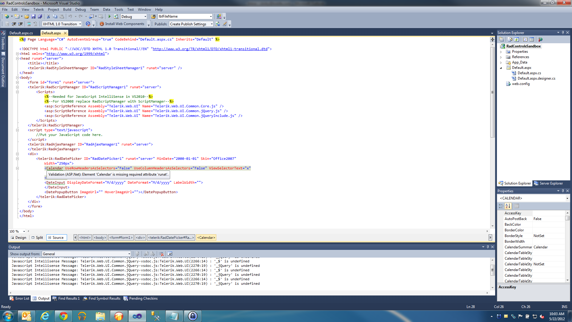The Calendar and DateInputs are defined as a properties for RadDatePicker, and they should not have the "runat" attribute set. Indeed setting it makes no difference to the behaviour, it only fixes the intelisenses warning. I don't see any particular problem with the definition of the Calendar and the Picker inside our code. It could be some bug in the VisualStudio, that to shows this warnings.