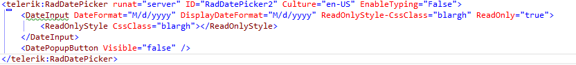 <telerik:RadDatePicker ID="RadDatePicker1" Runat="server"> </telerik:RadDatePicker>Thanks,