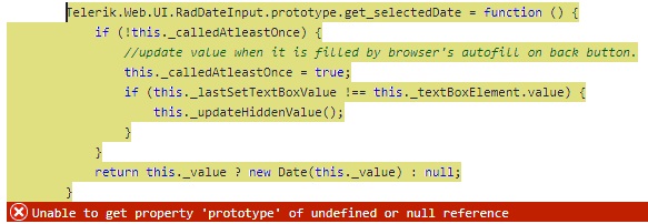 <script type="text/javascript"> Telerik.Web.UI.RadDateInput.prototype.get_selectedDate = function () { if (!this._calledAtleastOnce) { //update value when it is filled by browser's autofill on back button. this._calledAtleastOnce = true; if (this._lastSetTextBoxValue !== this._textBoxElement.value) { this._updateHiddenValue(); } } return this._value ? new Date(this._value) : null; }</script>Regards,