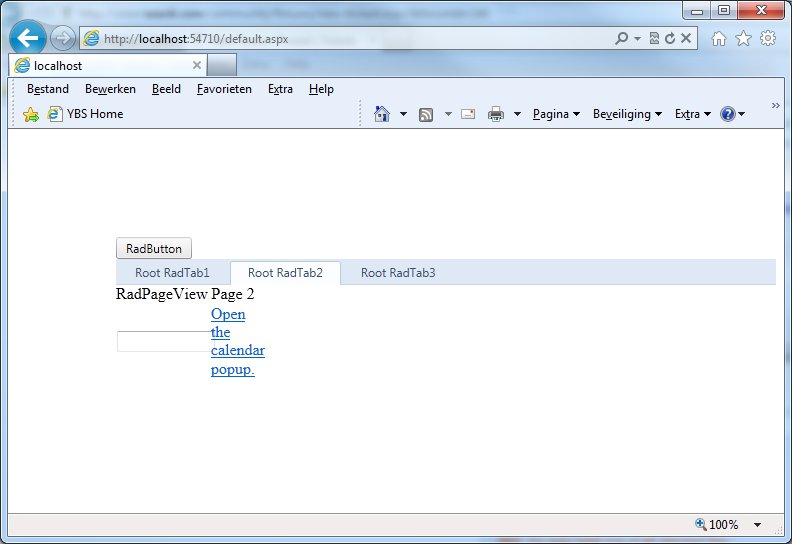 The RadDatePicker is on a RadMultiPage in a UserControl that is set to visibele after clicking a button in the NamingContainer (in the sampel a aspx but in my project also a UserControl) of the UserControl. The UserControl has a RadAjaxPanel on it which contains the RadDatePicker, the NamingContainer als has a RadAjaxPanel.