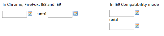 <%@ Page Language="C#" AutoEventWireup="true" CodeFile="Test2.aspx.cs" Inherits="Tests_Test2" %><%@ Register Assembly="Telerik.Web.UI" Namespace="Telerik.Web.UI" TagPrefix="telerik" %><!DOCTYPE html><html xmlns="http://www.w3.org/1999/xhtml"><head runat="server"> <meta http-equiv="X-UA-Compatible" content="IE=edge,chrome=1" /> <title></title></head><body> <form id="form1" runat="server"> <asp:ScriptManager EnableScriptGlobalization="true" runat="server" ID="scriptManager" EnablePartialRendering="True" /> <div> <telerik:RadDatePicker ID="RadDatePicker1" runat="server" MinDate="1900-01-01" MaxDate="2099-12-31" Width="110px"> <DateInput ID="DateInput1" runat="server" DateFormat="dd-MM-yyyy" DisplayDateFormat="dd-MM-yyyy"></DateInput> <DatePopupButton ImageUrl="~/images/calendar.png" HoverImageUrl="~/images/calendar.png" /> </telerik:RadDatePicker> until <telerik:RadDatePicker ID="RadDatePicker2" runat="server" MinDate="1900-01-01" MaxDate="2099-12-31" Width="110px"> <DateInput ID="DateInput2" runat="server" DateFormat="dd-MM-yyyy" DisplayDateFormat="dd-MM-yyyy"></DateInput> <DatePopupButton ImageUrl="~/images/calendar.png" HoverImageUrl="~/images/calendar.png" /> </telerik:RadDatePicker> </div> </form></body></html>12 Answers, 1 is accepted
