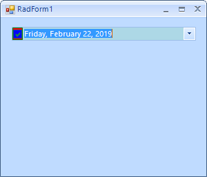 // Changes the color of the element holding the check boxthis.radDateTimePicker1.DateTimePickerElement.CheckBox.ButtonFillElement.ShouldPaint = true;this.radDateTimePicker1.DateTimePickerElement.CheckBox.ButtonFillElement.NumberOfColors = 1;this.radDateTimePicker1.DateTimePickerElement.CheckBox.ButtonFillElement.BackColor = Color.Red;// Changes the color of the border around the check markthis.radDateTimePicker1.DateTimePickerElement.CheckBox.BorderElement.ShouldPaint = true;this.radDateTimePicker1.DateTimePickerElement.CheckBox.BorderElement.ForeColor = Color.Green;// Changes the color of the element holding the check mark primitivethis.radDateTimePicker1.DateTimePickerElement.CheckBox.CheckMarkPrimitive.Fill.NumberOfColors = 1;this.radDateTimePicker1.DateTimePickerElement.CheckBox.CheckMarkPrimitive.Fill.BackColor = Color.Blue;// Changes the color of the text partthis.radDateTimePicker1.DateTimePickerElement.TextBoxElement.BackColor = Color.LightBlue;this.radDateTimePicker1.DateTimePickerElement.TextBoxElement.Fill.BackColor = Color.LightBlue;I am also attaching a screenshot showing the result on my end.
