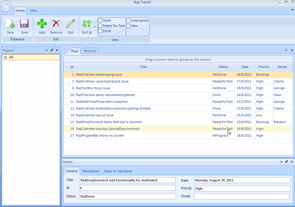 private void ReadOnlyControls(bool readOnly){ titleTextBox.ReadOnly = readOnly; idSpinEditor.ReadOnly = readOnly; descriptionTextBox.ReadOnly = readOnly; stepsToReproduceTextBox.ReadOnly = readOnly; idSpinEditor.ShowUpDownButtons = !readOnly; dateDateTimePicker.DateTimePickerElement.TextBoxElement.TextBoxItem.ReadOnly = readOnly; RadDateTimePickerArrowButtonElement arrowButton = dateDateTimePicker.DateTimePickerElement.Children[1].Children[1] as RadDateTimePickerArrowButtonElement; arrowButton.Visibility = readOnly ? ElementVisibility.Collapsed : ElementVisibility.Visible; priorityDropDownList.DropDownListElement.ArrowButton.Visibility = readOnly ? ElementVisibility.Collapsed : ElementVisibility.Visible; priorityDropDownList.DropDownListElement.TextBox.TextBoxItem.ReadOnly = readOnly; statusDropDownList.DropDownListElement.ArrowButton.Visibility = readOnly ? ElementVisibility.Collapsed : ElementVisibility.Visible; statusDropDownList.DropDownListElement.TextBox.TextBoxItem.ReadOnly = readOnly; ownerDropDownList.DropDownListElement.ArrowButton.Visibility = readOnly ? ElementVisibility.Collapsed : ElementVisibility.Visible; ownerDropDownList.DropDownListElement.TextBox.TextBoxItem.ReadOnly = readOnly;}