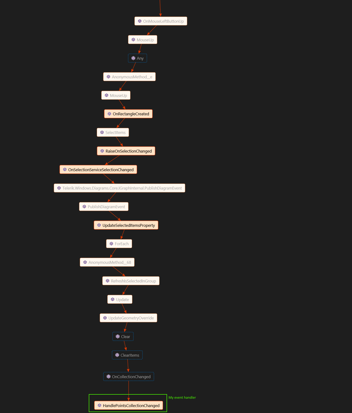 especially fragment i.RefreshIsSelectedInGroup(); which causes update if IsSelectedInGroup state occured. Update couses this.UpdateGeometryOverride() and so on... to lines 1121 and 1222 - RadDiagramConnection: