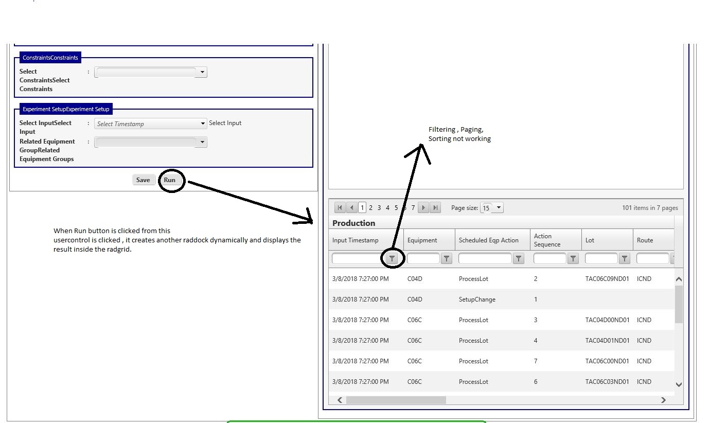 Using the MyPortal Demo as a reference, a raddock is dynamically created from a button click. Inside this raddock it has a 'Run' button which when clicked runs an .exe file and creates another RadDock dynamically by loading a usercontrol used to displays the run results on the docking zone. The result is displayed as Ragrid records. The issue is that I am not able to filter, sort or do paging on this radgrid. Is there a solution for this??