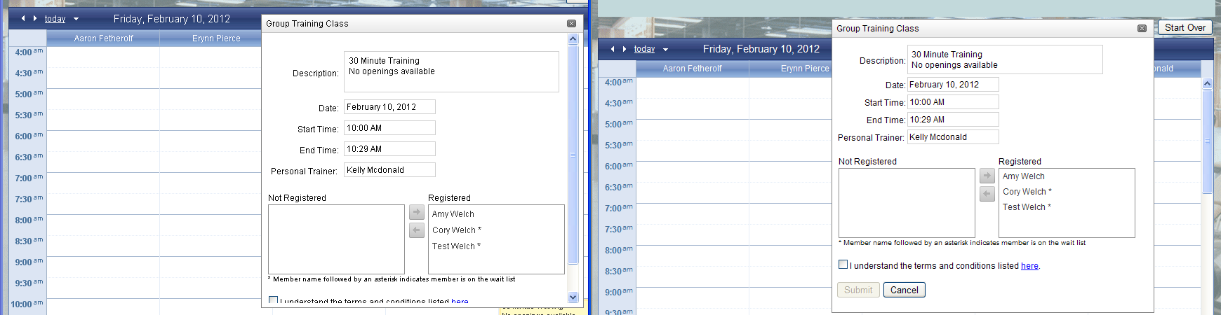 <asp:Panel runat="server" ID="DockPanel"> <telerik:RadDock runat="server" ID="RadDock1" Width="445px" Height="410px" Closed="true" Style="z-index: 2000;" Title="Group Training Class" OnClientDockPositionChanged="dockMoved"> <Commands> <telerik:DockCloseCommand /> </Commands> <ContentTemplate> <div class="editForm"> <div class="content"> <table border="0" cellpadding="2" cellspacing = "5"> <tr><td></td><td></td></tr> <tr><td></td><td></td></tr> <tr> <td align="right" style="padding:3px 0px 0px 0px;"> <asp:Label ID="label1" runat="server">Description:</asp:Label> </td> <td> <telerik:RadTextBox ID="description" runat="server" TextMode="MultiLine" Rows="2" Columns="50" ReadOnly="true" Style="padding:5px;"></telerik:RadTextBox> </td> </tr> <tr> <td align="right" style="padding:3px 0px 0px 0px;"> <asp:Label ID="label2" runat="server">Date:</asp:Label> </td> <td> <telerik:RadTextBox ID="date" runat="server" ReadOnly="true" style="padding:2px;"></telerik:RadTextBox> </td> </tr> <tr> <td align="right" style="padding:3px 0px 0px 0px;"> <asp:Label ID="label3" runat="server">Start Time:</asp:Label> </td> <td> <telerik:RadTextBox ID="start_time" runat="server" ReadOnly="true" style="padding:2px;"></telerik:RadTextBox> </td> </tr> <tr> <td align="right" style="padding:3px 0px 0px 0px;"> <asp:Label ID="label4" runat="server">End Time:</asp:Label> </td> <td> <telerik:RadTextBox ID="end_time" runat="server" ReadOnly="true" style="padding:2px;"></telerik:RadTextBox> </td> </tr> <tr> <td align="right" style="padding:3px 0px 0px 0px;"> <asp:Label ID="label5" runat="server" style="padding:2px;">Personal Trainer:</asp:Label> </td> <td> <telerik:RadTextBox ID="personal_trainer" runat="server" ReadOnly="true" style="padding:2px;"></telerik:RadTextBox> </td> </tr> <tr style="display:none;"> <td align="right"> <asp:Label ID="label7" runat="server">Registered Members:</asp:Label> </td> <td> <telerik:RadTextBox ID="registered_members" runat="server" TextMode="MultiLine" Rows="2" Columns="50" ReadOnly="true"></telerik:RadTextBox> </td> </tr> <tr style="display:none;"> <td align="right"> <asp:Label ID="label8" runat="server">Wait List Members:</asp:Label> </td> <td> <telerik:RadTextBox ID="wait_members" runat="server" TextMode="MultiLine" Rows="2" Columns="50" ReadOnly="true"></telerik:RadTextBox> </td> </tr> <tr style="display:none;"> <td align="right"> <asp:Label ID="label9" runat="server">Date (mm/dd/yyyy format):</asp:Label> </td> <td> <telerik:RadTextBox ID="date_mmddyyyy" runat="server" ReadOnly="true"></telerik:RadTextBox> </td> </tr> <tr style="display:none;"> <td align="right"> <asp:Label ID="label10" runat="server">Start Time (hh:mm format):</asp:Label> </td> <td> <telerik:RadTextBox ID="start_time_hhmm" runat="server" ReadOnly="true"></telerik:RadTextBox> </td> </tr> </table> <br /> <span style="padding:0px 145px 0px 3px;">Not Registered</span><span>Registered</span> <telerik:RadAjaxPanel ID="RadAjaxPanel1" runat="server" style="padding: 2px 0px 0px 3px;"> <telerik:RadListBox ID="members_not_assigned" runat="server" Width="225px" Height="100px" SelectionMode="Single" AllowTransfer="true" TransferToID="members_assigned" AutoPostBackOnTransfer="false" AllowReorder="false" AutoPostBackOnReorder="false" EnableDragAndDrop="true" ButtonSettings-ShowTransferAll="false" OnClientTransferring="TransferringListBoxItem"> </telerik:RadListBox> <telerik:RadListBox ID="members_assigned" runat="server" Width="195px" Height="100px" SelectionMode="Single" AllowReorder="false" AutoPostBackOnReorder="true" EnableDragAndDrop="true"> </telerik:RadListBox> </telerik:RadAjaxPanel> <label style="padding: 0px 0px 0px 3px; font-size:smaller">* Member name followed by an asterisk indicates member is on the wait list</label> </div> <br /> <div> <input type="checkbox" id="agree" onclick="UpdateSubmitButton()" />I understand the terms and conditions listed <a href="TermsAndConditions.aspx" target="_blank"> here</a>. </div> <br /> <div class="footer"> <button id="submit" onclick="UpdateAppointment()" type="button" disabled="disabled">Submit</button> <button onclick="hideForm();" type="button">Cancel</button> </div> </div> </ContentTemplate> </telerik:RadDock> </asp:Panel>Thank you in advance.