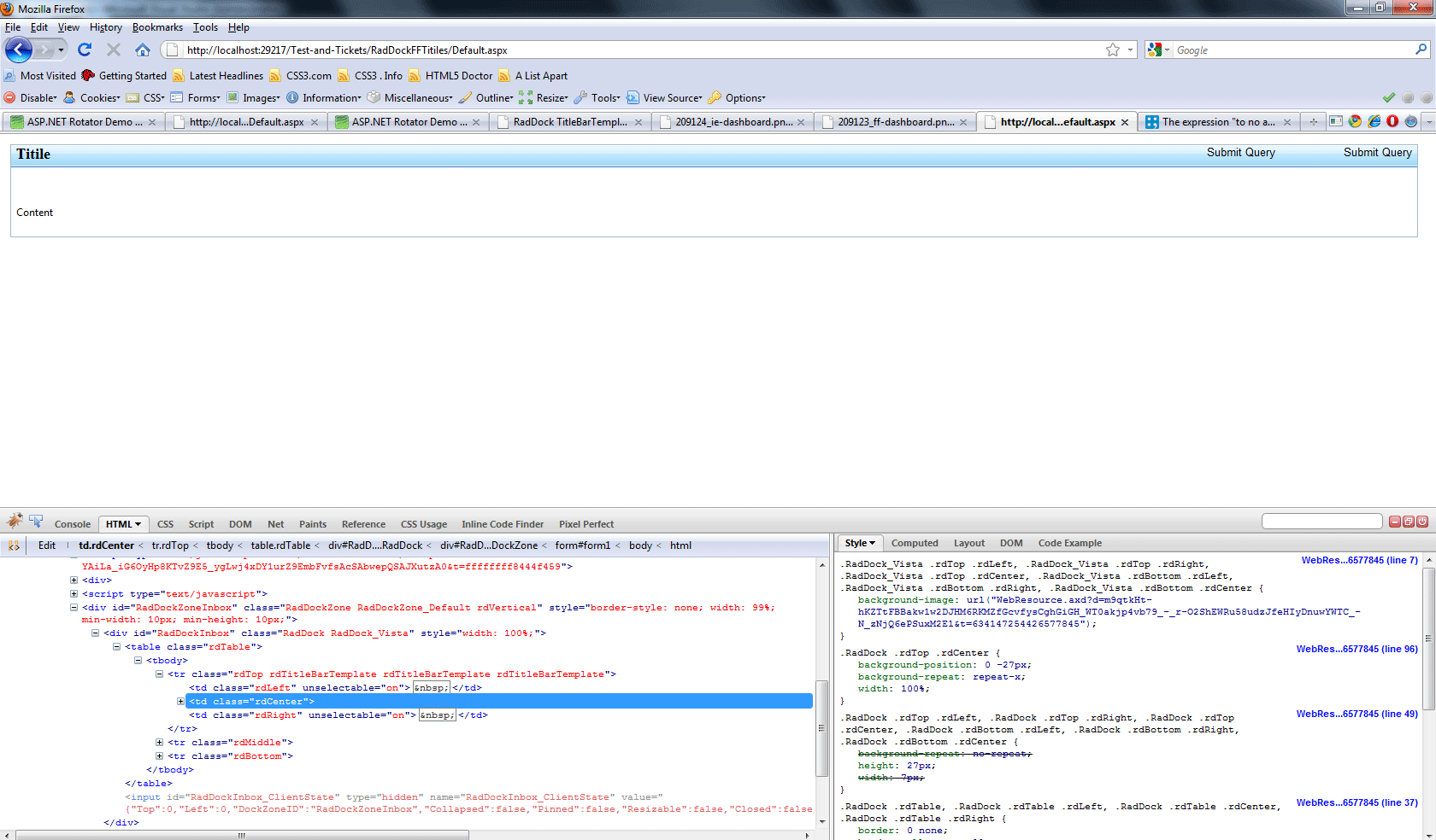 4 of the docks have a user control which has a RadListView, and the other dock has a user control with a RadGrid inside of it. The dock with the RadGrid is rendering perfectly in both IE and FireFox but the other 4 docks (with ListViews) are not. The titlebar template is displaying this weird squiggly curtain-looking thing. I checked it out both in IE developer tools and Firebug and I'm sure it has to do with the embedded image HorizontalSprite.gif. That sprite shows three different versions of the same header. IE is using the squared version but FF is using the middle image. How do I make FF display the same image as IE??
