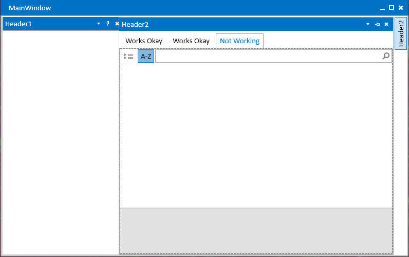<telerik:RadWindow x:Class="WpfApp1.MainWindow" xmlns:telerik="http://schemas.telerik.com/2008/xaml/presentation" Header="MainWindow" Height="500" Width="800"> <Grid> <telerik:RadDocking x:Name="radDocking1" RetainPaneSizeMode="DockingAndFloating"> <telerik:RadSplitContainer Name="LeftContainer" InitialPosition="DockedLeft"> <telerik:RadPaneGroup x:Name="Group1"> <telerik:RadPane x:Name="mtPane" Header="Header1"> </telerik:RadPane> </telerik:RadPaneGroup> </telerik:RadSplitContainer> <telerik:RadSplitContainer x:Name="RightContainer" InitialPosition="DockedRight"> <telerik:RadPaneGroup x:Name="Group2" Margin="-310,0,6,0"> <telerik:RadPane x:Name="ssPane" Header="Header2" IsPinned="false"> <Grid HorizontalAlignment="Stretch" VerticalAlignment="Stretch" > <Grid HorizontalAlignment="Stretch" VerticalAlignment="Top" > </Grid> <telerik:RadTabControl x:Name="radTabControl" HorizontalAlignment="Stretch" VerticalAlignment="Stretch"> <telerik:RadTabItem x:Name="RadTabSettings" Header="Works Okay" Height="30"> </telerik:RadTabItem> <telerik:RadTabItem x:Name="RadTabSelections" Header="Works Okay" Height="30"> </telerik:RadTabItem> <telerik:RadTabItem x:Name="RadTabStaking" Header="Not Working" > <telerik:RadPropertyGrid x:Name="propertyGridEventStaking"> </telerik:RadPropertyGrid> </telerik:RadTabItem> </telerik:RadTabControl> </Grid> </telerik:RadPane> </telerik:RadPaneGroup> </telerik:RadSplitContainer> </telerik:RadDocking> </Grid></telerik:RadWindow>