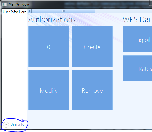<telerik:RadDockPanel x:Name="LaunchScreenDockPanel" LastChildFill="True"> <telerik:RadExpander x:Name="UserInfo" ExpandDirection="Up" IsExpanded="True"></telerik:RadExpander> <WindowsFormsHost HorizontalAlignment="Stretch" Name="windowsFormsHost1" VerticalAlignment="Stretch" > <wincontrols:RadPanorama x:Name="LaunchPadPanorama" Size="200,400" RowsCount="2" MinimumColumns="2" ShowGroups="True" Dock="Fill">