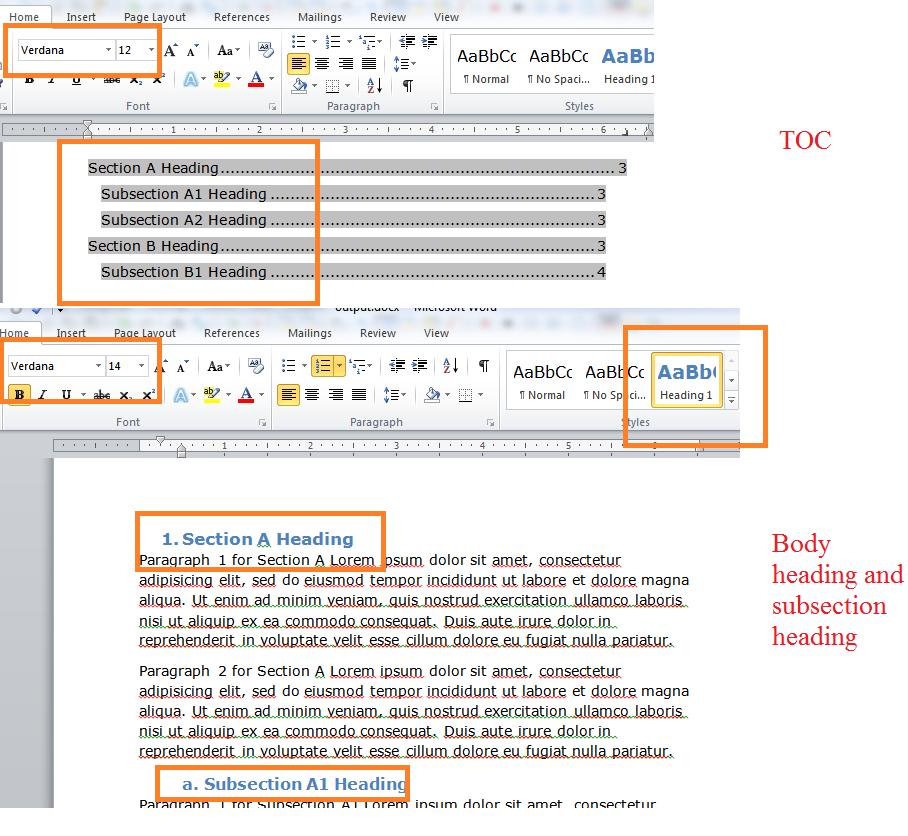 Here are the Font sizes before and after updating the TOC1, TOC2, Heading1 and Heading2 font styles. Notice that the Heading 1 and 2 did not get updated.