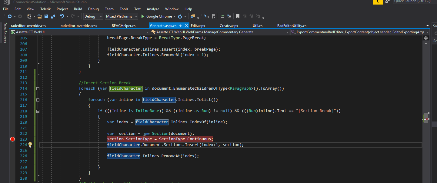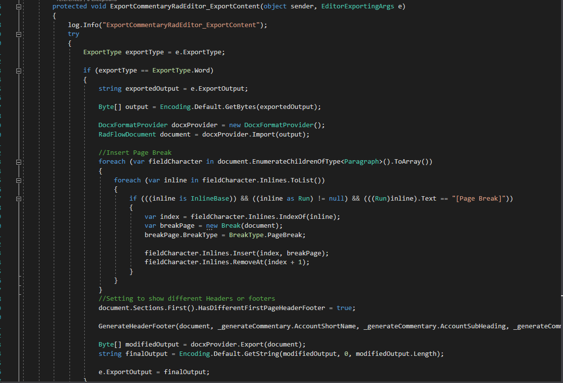In the meantime the code below shows a possible approach to insert a Section Break using RadRichTextBox' Search functionality.