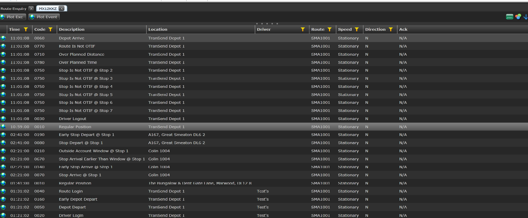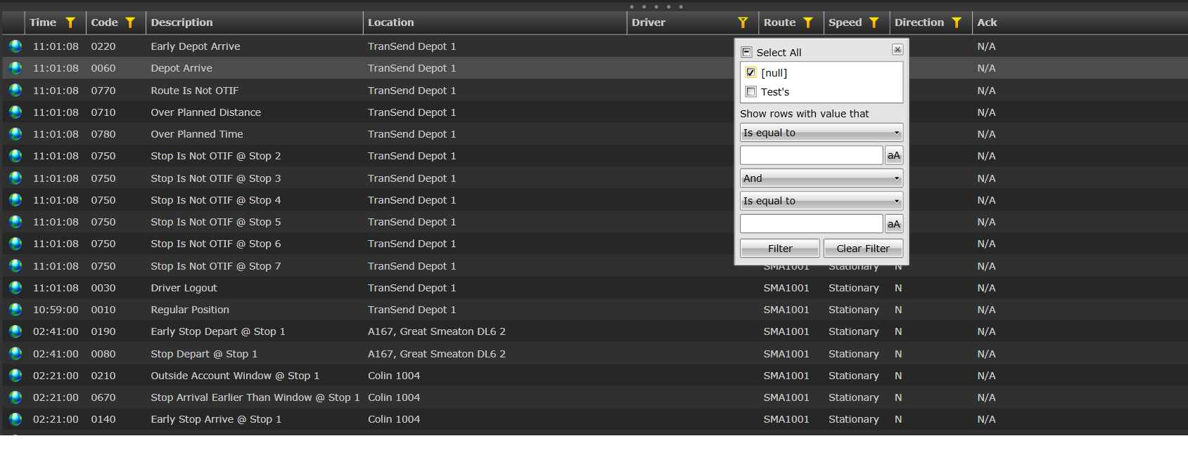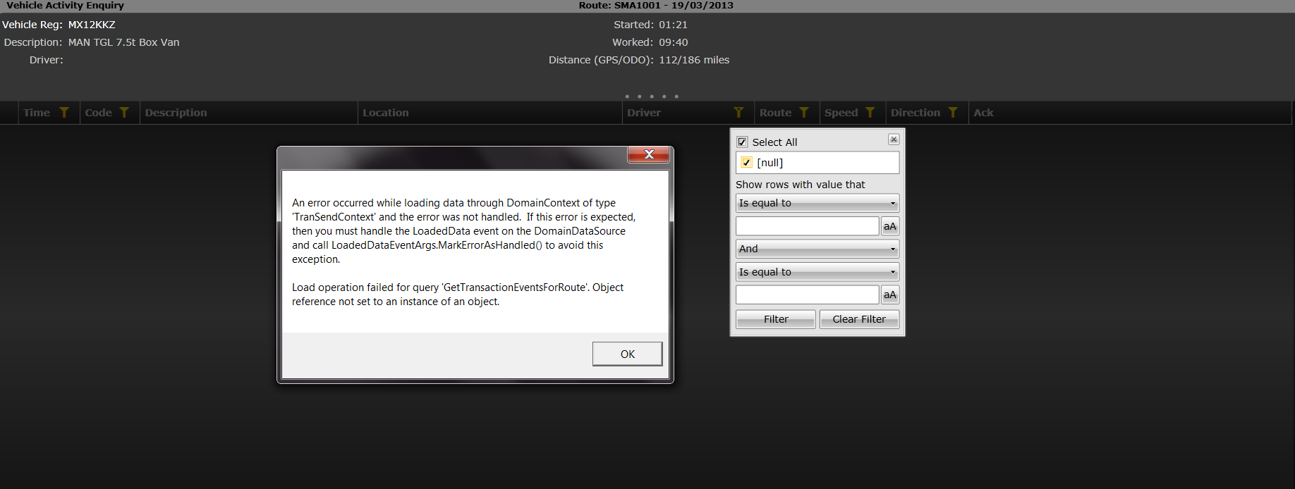 "GetTransactionEventsForRoute" query runs successfully on the sever. I have also tested the same query against the DomainDataSource and filter works fine with null values in the Driver Column. See the attached screen shot.