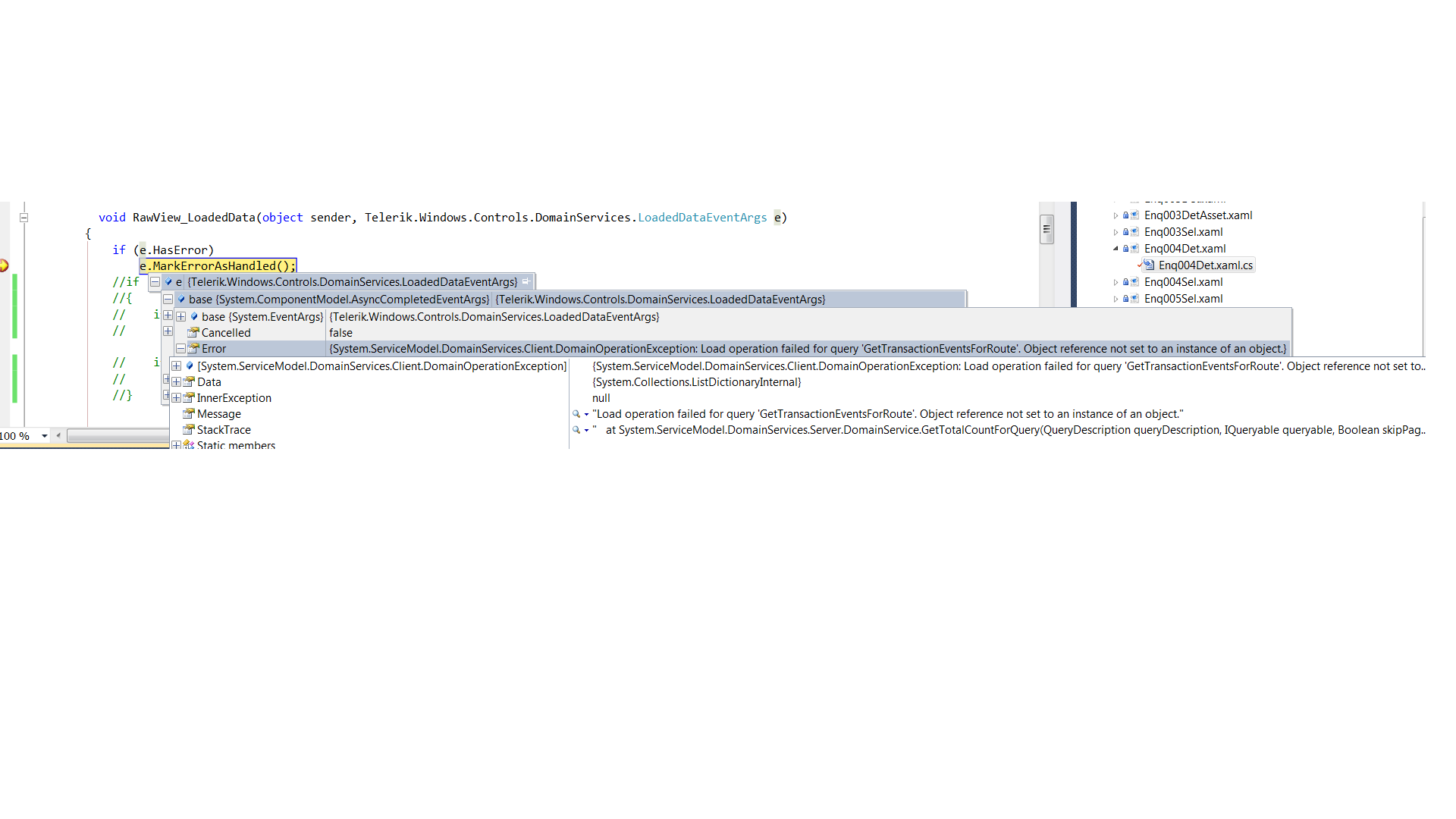 I have added in the code to subscribe for the LoadedData and have called LoadedDataEventArgs.MarkErrorAsHandled(). By adding this it is just avoiding to display as the exception is being marked as handled. Please see the attached file HandledError.png