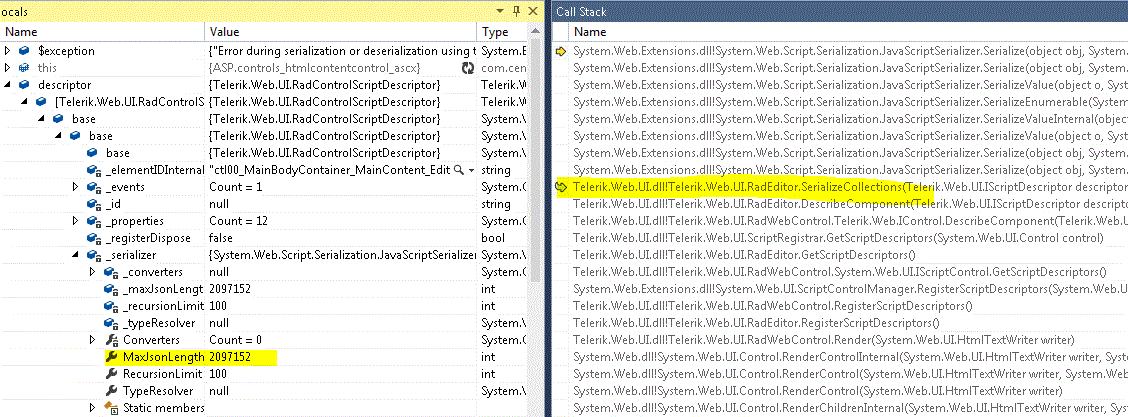 Exception Details: System.InvalidOperationException: Error during serialization or deserialization using the JSON JavaScriptSerializer. The length of the string exceeds the value set on the maxJsonLength property.