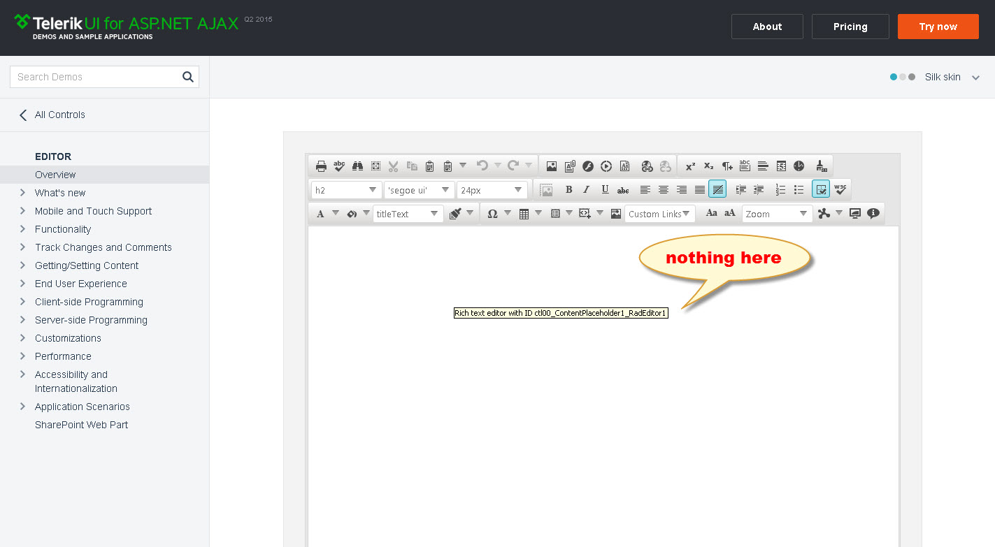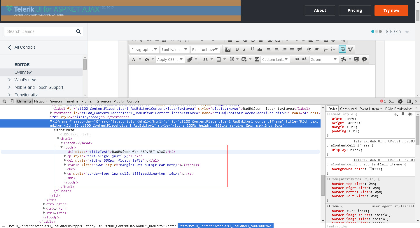 As you can see the HTML dedicated for the content area is rendered as HTML, but it is up to the browser to show it.