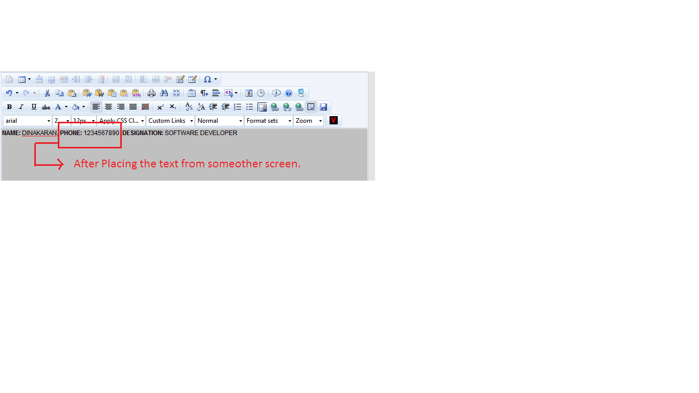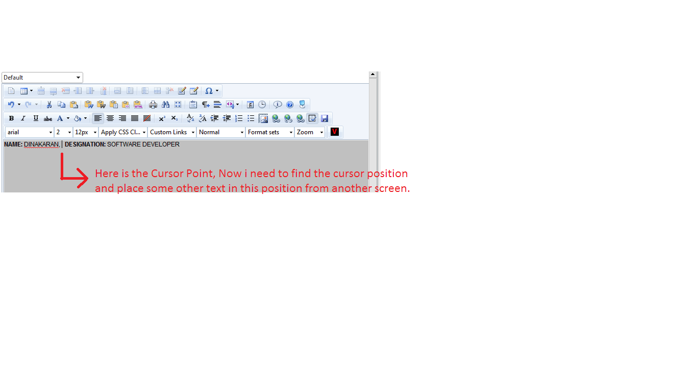 I need to find the RadEditor cursor position to place some text from another screen,i have tried to find the cursor position at the end of the each line but i can't able to find the cursor position between the words,please refer the images to analyse.