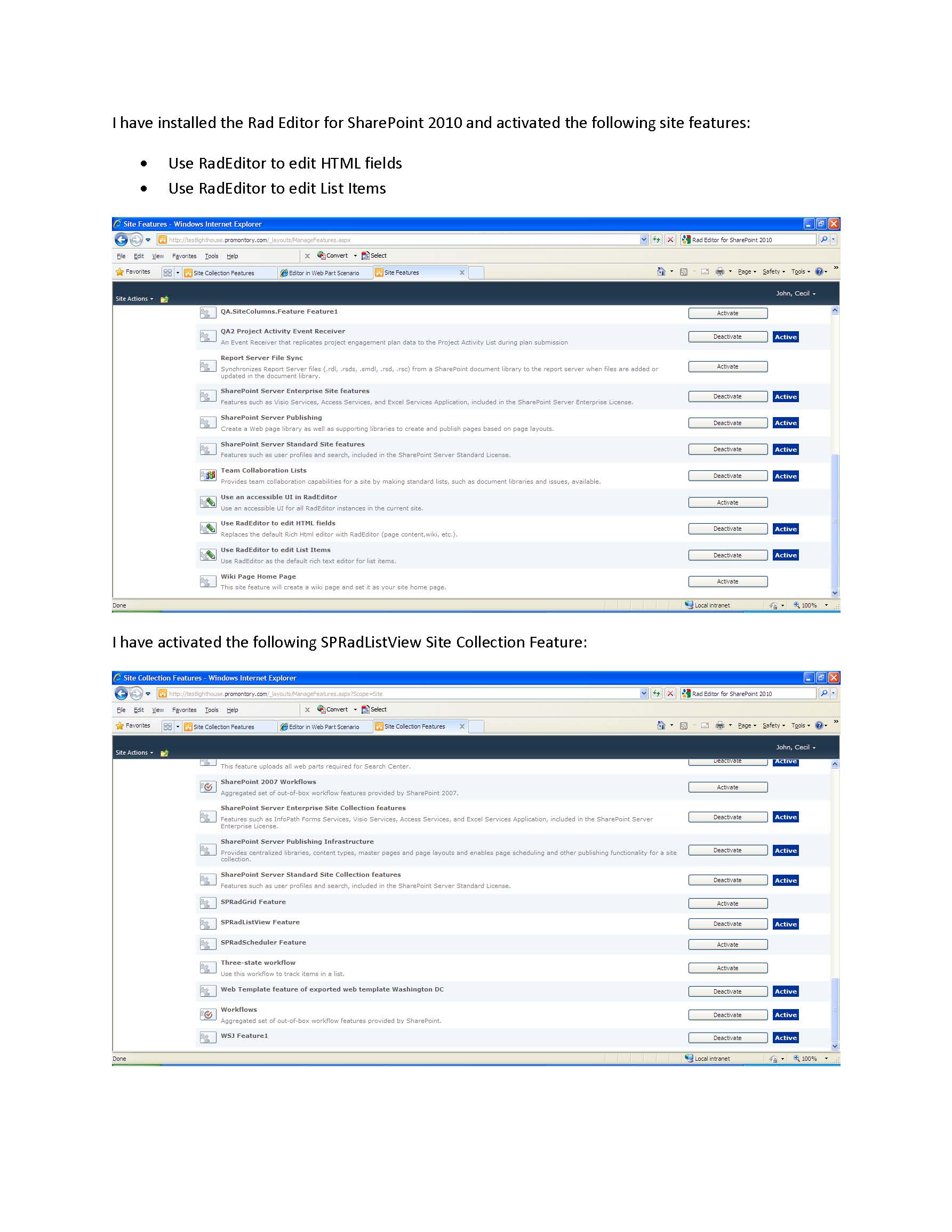 I have installed the Rad Editor for SharePoint 2010 and activated the following site features: