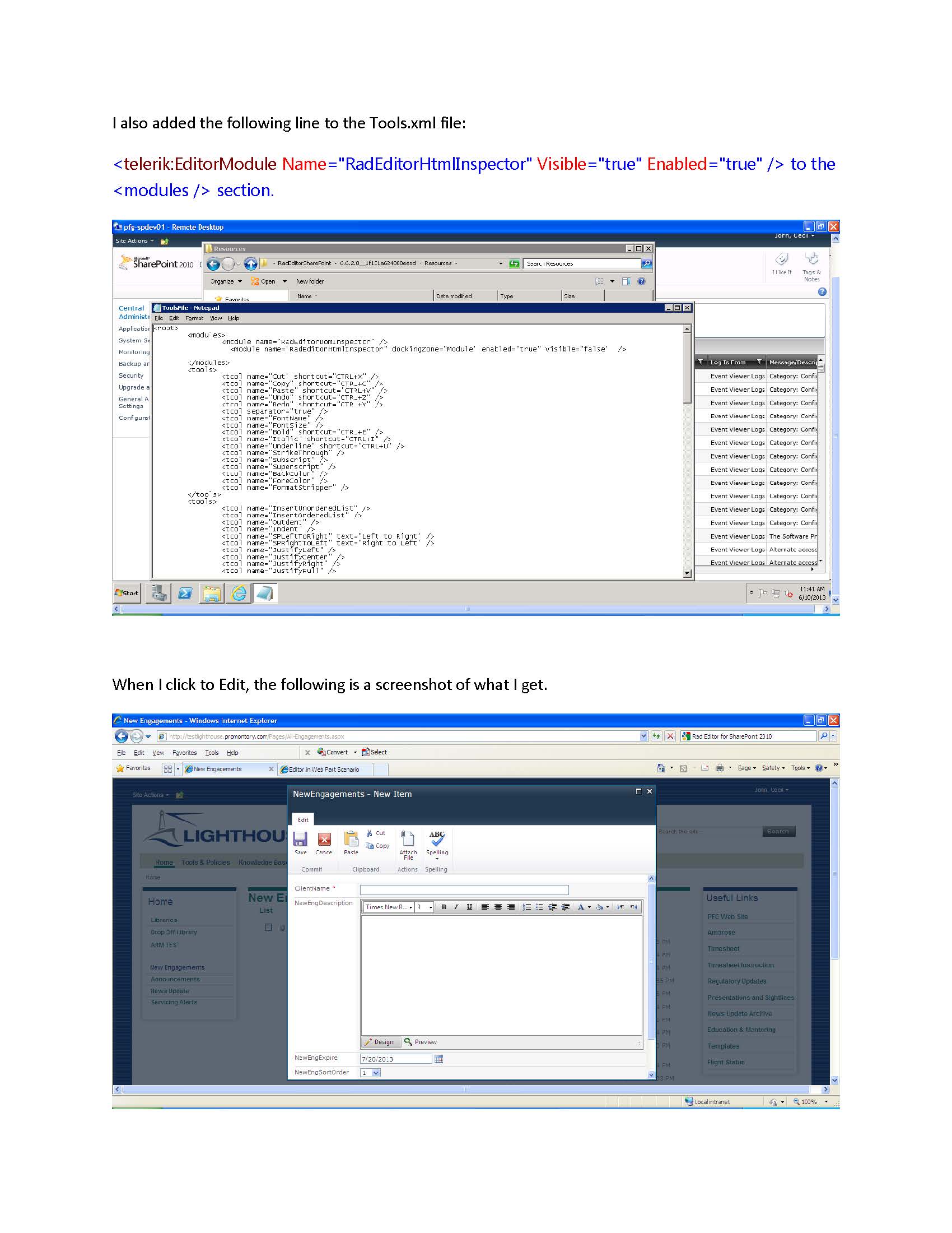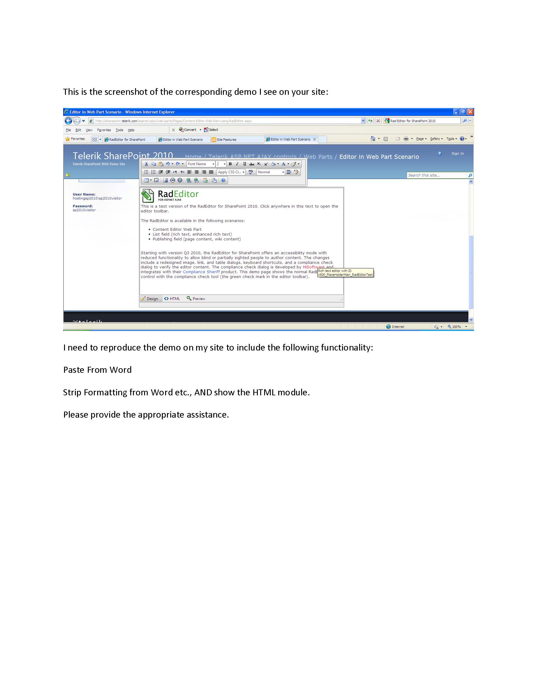 Basically, what I have showing up in SharePoint is not consistent with the demo on your site: http://sharepoint.telerik.com/aspnet-ajax/web-parts/Pages/Content-Editor-Web-Part-using-RadEditor.aspxI also need to add the following functionality to the editor.