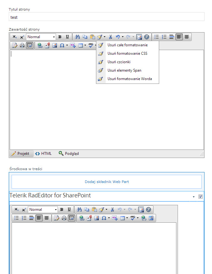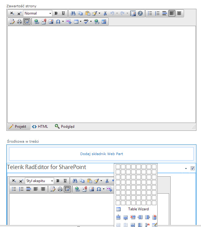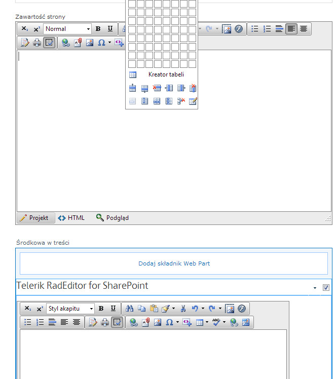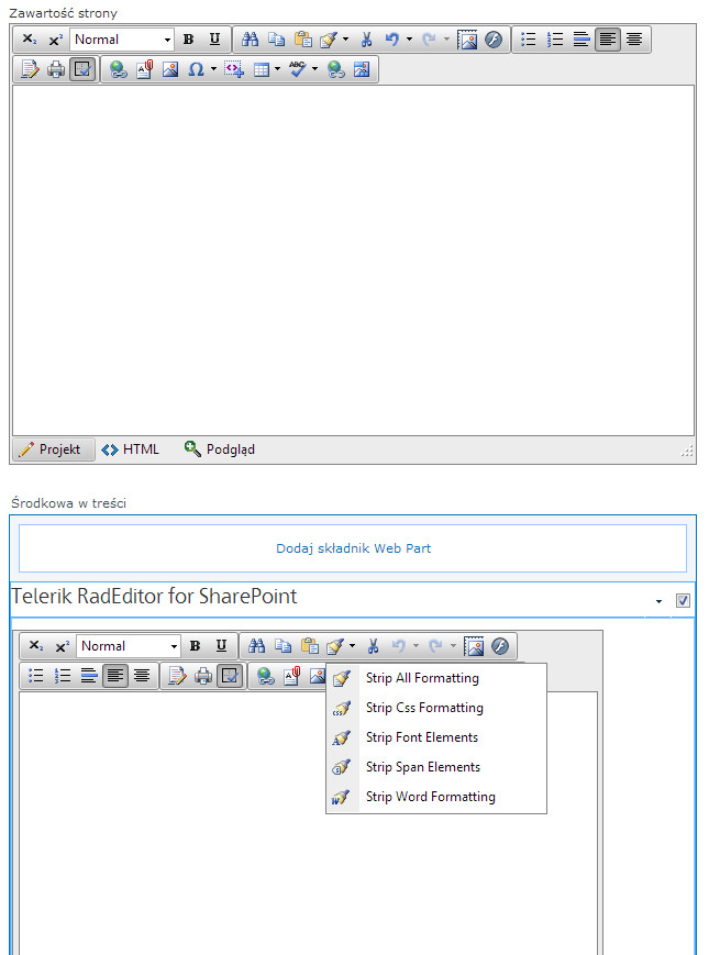 I have a problem when trying to localize some elements of editor in its webpart version. For some reason in the editor which replaces content editor, localization behaves as expected, but in the editor which is in the webpart (default telerik rad editor for sharepoint webpart), there are still english labels in the table wizard dropdown and Strip Css Formatting dropdown, while other things in the same editor are translated correctly. Please see attached images.