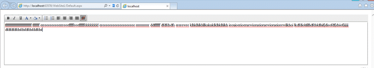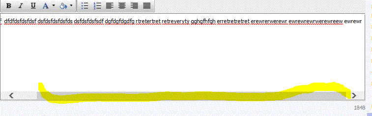In my sample application, I am using RadEditor with below properties. when I have ran the application and enter long text and I am not seen any horizontal scrollbar (see first_screen) then copied the same properties on "RadEditor" and using my existing application and entered long text I am receiving Horizontal scrollbar (Second pic) please.