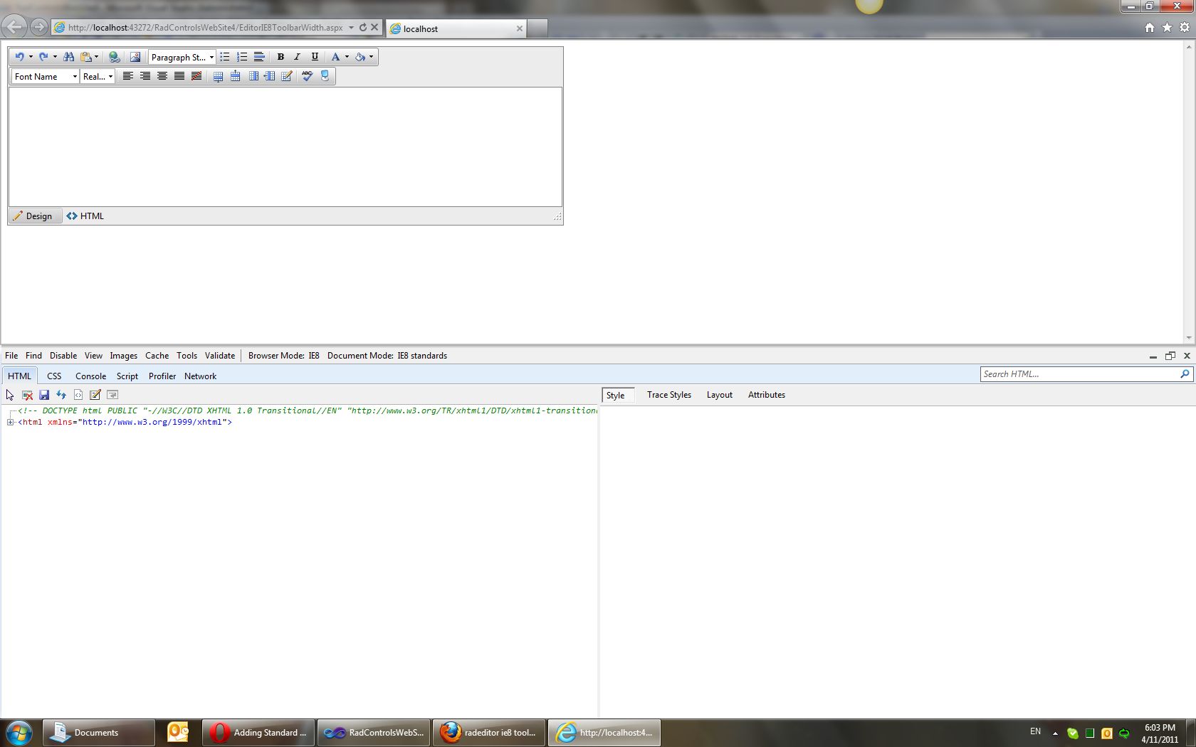 Ive tried setting width and toolswidth and neither are being rendered right in ie8. Below is our code. How do you set the width of the radeditor in ie8?