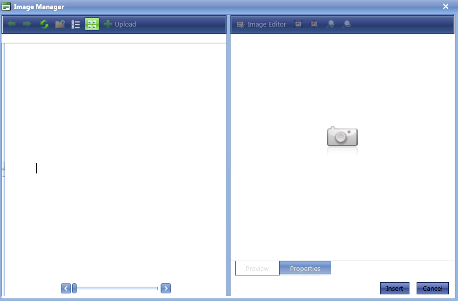 string imgPath = GenerateOutputDirectory(false);CreateDirectoryIfNotExist(imgPath);RadEditor1.ImageManager.ViewPaths = new string [] {imgPath};RadEditor1.ImageManager.UploadPaths = new string[] { imgPath };RadEditor1.ImageManager.EnableAsyncUpload = true;RadEditor1.ImageManager.SearchPatterns = new string[] { "*.jpeg", "*.jpg", "*.bmp", "*.gif", "*.png" };I create a string that creates the virtual path in imgPath, then if the directory does not exist, I create it so the imgPath exists for sure. Then I attempt to set the View and Upload path of the image manager to have those folders. However, when I open the image manager, this is what I see: (attached .png image)