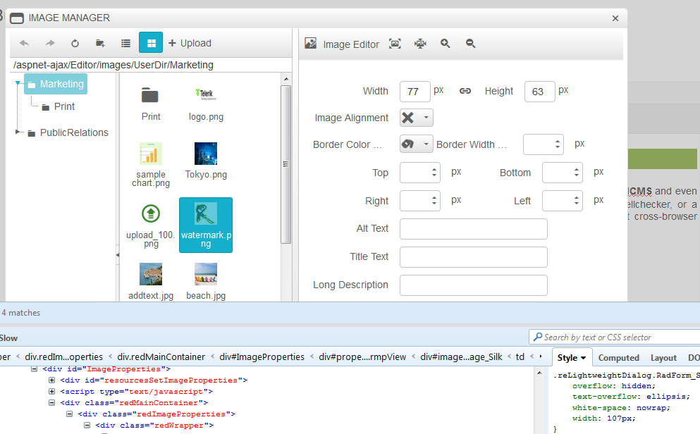 Hi, I have implemented a custom FileBrowserContentProvider for Azure and customized the file bowser by following the steps on the “Editor - Customize Built-in Dialogs” article (http://demos.telerik.com/aspnet-ajax/editor/examples/externaldialogspath/defaultcs.aspx).