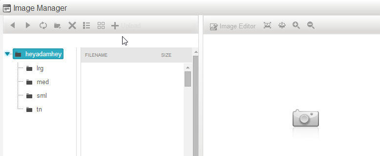<system.webServer> <modules runAllManagedModulesForAllRequests="true"> <remove name="RadUploadModule" /> <remove name="RadCompression" /><add name="UrlRewriter" type="Intelligencia.UrlRewriter.RewriterHttpModule, Intelligencia.UrlRewriter" /> <add name="ExceptionlessModule" type="Exceptionless.Web.ExceptionlessModule, Exceptionless.Web" /> <add name="RadUploadModule" type="Telerik.Web.UI.RadUploadHttpModule" preCondition="integratedMode" /> <add name="RadCompression" type="Telerik.Web.UI.RadCompression" preCondition="integratedMode" /> </modules> <validation validateIntegratedModeConfiguration="false" /> <handlers> <remove name="ChartImage_axd" /> <remove name="Telerik_Web_UI_SpellCheckHandler_axd" /> <remove name="Telerik_Web_UI_DialogHandler_aspx" /> <remove name="Telerik_RadUploadProgressHandler_ashx" /> <remove name="Telerik_Web_UI_WebResource_axd" /> <add name="Telerik_Web_UI_DialogHandler_aspx" path="Telerik.Web.UI.DialogHandler.aspx" type="Telerik.Web.UI.DialogHandler" verb="*" preCondition="integratedMode" /> <add name="Telerik_Web_UI_WebResource_axd" path="Telerik.Web.UI.WebResource.axd" type="Telerik.Web.UI.WebResource" verb="*" preCondition="integratedMode" /> <add name="Telerik_Web_UI_SpellCheckHandler_axd" path="Telerik.Web.UI.SpellCheckHandler.axd" type="Telerik.Web.UI.SpellCheckHandler" verb="*" preCondition="integratedMode" /> <add name="ChartImage_axd" path="ChartImage.axd" type="Telerik.Web.UI.ChartHttpHandler" verb="*" preCondition="integratedMode" /> <add name="Telerik_RadUploadProgressHandler_ashx" path="Telerik.RadUploadProgressHandler.ashx" type="Telerik.Web.UI.RadUploadProgressHandler" verb="*" preCondition="integratedMode" /> </handlers></system.webServer><telerik:RadEditor ID="BodyRadEditor" runat="server" Width="100%" AllowScripts="True"> <ContextMenus> <telerik:EditorContextMenu TagName="IMG"> <telerik:EditorTool Name="SetImageProperties" /> </telerik:EditorContextMenu> <telerik:EditorContextMenu TagName="TABLE"> <telerik:EditorTool Name="ToggleTableBorder" /> <telerik:EditorTool Name="SetTableProperties" /> <telerik:EditorTool Name="DeleteTable" /> </telerik:EditorContextMenu> <telerik:EditorContextMenu TagName="TD"> <telerik:EditorTool Name="InsertRowAbove" /> <telerik:EditorTool Name="InsertRowBelow" /> <telerik:EditorTool Name="DeleteRow" /> <telerik:EditorTool Name="InsertColumnLeft" /> <telerik:EditorTool Name="InsertColumnRight" /> <telerik:EditorTool Name="MergeColumns" /> <telerik:EditorTool Name="MergeRows" /> <telerik:EditorTool Name="SplitCell" /> <telerik:EditorTool Name="DeleteCell" /> <telerik:EditorTool Name="SetCellProperties" /> </telerik:EditorContextMenu> <telerik:EditorContextMenu TagName="BODY"> <telerik:EditorTool Name="PasteFromWord" /> <telerik:EditorTool Name="PastePlainText" /> <telerik:EditorTool Name="PasteAsHtml" /> </telerik:EditorContextMenu> </ContextMenus> <Tools> <telerik:EditorToolGroup Tag="MainToolbar"> <telerik:EditorSplitButton Name="Undo"> </telerik:EditorSplitButton> <telerik:EditorSplitButton Name="Redo"> </telerik:EditorSplitButton> <telerik:EditorSeparator /> <telerik:EditorTool Name="Print" ShortCut="CTRL+P / CMD+P" /> <telerik:EditorTool Name="AjaxSpellCheck" /> <telerik:EditorTool Name="FindAndReplace" ShortCut="CTRL+F / CMD+F" /> <telerik:EditorTool Name="SelectAll" ShortCut="CTRL+A / CMD+A" /> <telerik:EditorTool Name="Cut" ShortCut="CTRL+X / CMD+X" /> <telerik:EditorTool Name="Copy" ShortCut="CTRL+C / CMD+C" /> <telerik:EditorTool Name="Paste" ShortCut="CTRL+V / CMD+V" /> <telerik:EditorToolStrip Name="PasteStrip"> </telerik:EditorToolStrip> </telerik:EditorToolGroup> <telerik:EditorToolGroup Tag="InsertToolbar"> <telerik:EditorTool Name="ImageManager" ShortCut="CTRL+G / CMD+G" /> <telerik:EditorSeparator /> <telerik:EditorTool Name="LinkManager" /> <telerik:EditorTool Name="InsertLink" /> </telerik:EditorToolGroup> <telerik:EditorToolGroup Tag="DropdownToolbar"> <telerik:EditorSplitButton Name="InsertSymbol"> </telerik:EditorSplitButton> <telerik:EditorToolStrip Name="InsertTable"> </telerik:EditorToolStrip> <telerik:EditorTool Name="ToggleTableBorder" /> </telerik:EditorToolGroup> <telerik:EditorToolGroup> <telerik:EditorTool Name="JustifyLeft" /> <telerik:EditorTool Name="JustifyCenter" /> <telerik:EditorTool Name="JustifyRight" /> <telerik:EditorTool Name="JustifyFull" /> <telerik:EditorTool Name="JustifyNone" /> <telerik:EditorSeparator /> <telerik:EditorTool Name="Indent" /> <telerik:EditorTool Name="Outdent" /> <telerik:EditorSeparator /> <telerik:EditorTool Name="InsertOrderedList" /> <telerik:EditorTool Name="InsertUnorderedList" /> </telerik:EditorToolGroup> <telerik:EditorToolGroup> <telerik:EditorTool Name="FormatSets" /> <telerik:EditorTool Name="Bold" ShortCut="CTRL+B / CMD+B" /> <telerik:EditorTool Name="Italic" ShortCut="CTRL+I / CMD+I" /> <telerik:EditorTool Name="Underline" ShortCut="CTRL+U / CMD+U" /> <telerik:EditorTool Name="StrikeThrough" /> </telerik:EditorToolGroup> </Tools> <Content></Content> <ImageManager EnableAsyncUpload="true" AllowFileExtensionRename="False" AllowMultipleSelection="True" MaxUploadFileSize="2048000" DeletePaths="~/Uploads" UploadPaths="~/Uploads" ViewPaths="~/Uploads"></ImageManager> <TrackChangesSettings CanAcceptTrackChanges="False"></TrackChangesSettings></telerik:RadEditor> protected virtual void Page_Load(object sender, EventArgs e) { if (!IsPostBack) { ArticleMultiView.SetActiveView(ArticleFormView); if (!Directory.Exists(Server.MapPath(@"~/Uploads/" + user.Username))) Directory.CreateDirectory(Server.MapPath(@"~/Uploads/" + user.Username)); string[] path = new string[] { @"~/Uploads/" + user.Username + "/" }; BodyRadEditor.ImageManager.UploadPaths = path; BodyRadEditor.ImageManager.ViewPaths = path; BodyRadEditor.ImageManager.DeletePaths = path;......... } }