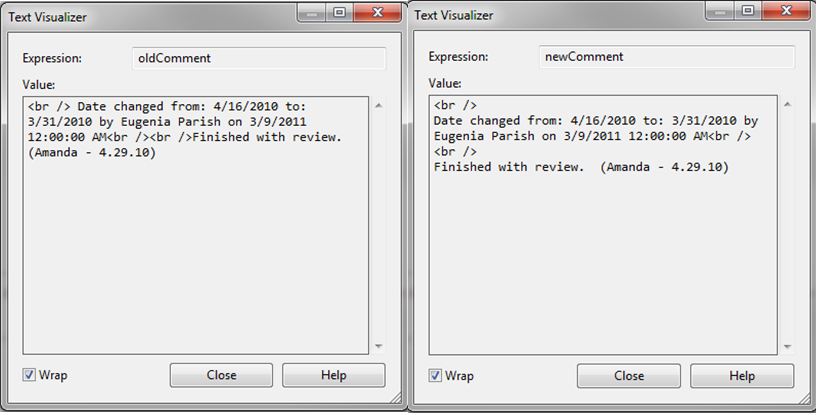 I have a weird quirk, and I am trying to figure out how to prevent it. I have an EditTemplate on my radgrid with a radeditor. This radeditor seems to be modifying my comments even if I don't actually type anything new. I'm trying to trap when users don't actually make a comment change, but that trap is being passed over with this quirk. I am attaching a picture of the differences as they appeared in the VS Text Visualizer. It shows that though they look very similar, there are some subtle differences, like magic carriage returns. Again, I am not typing anything new into the content area. I just click the edit button, then the update button. There should be no difference. (But there is)