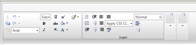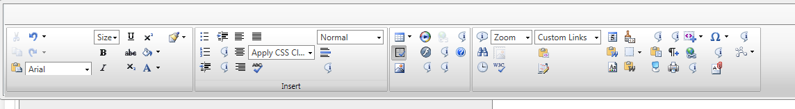 <root> <modules> <module name="RadEditorDomInspector" /> </modules> <tools> <tool name="Cut" shortcut="CTRL+X" /> <tool name="Copy" shortcut="CTRL+C" /> <tool name="Paste" shortcut="CTRL+V" /> <tool name="PastePlainText" /> <tool name="PasteAsHtml" /> <tool name="PasteFromWordNoFontsNoSizes" /> <tool name="PasteFromWord" /> <tool name="Undo" shortcut="CTRL+Z" /> <tool name="Redo" shortcut="CTRL+Y" /> </tools> <tools> <tool name="FontName" /> <tool name="FontSize" /> <tool name="Bold" shortcut="CTRL+B" /> <tool name="Italic" shortcut="CTRL+I" /> <tool name="Underline" shortcut="CTRL+U" /> <tool name="StrikeThrough" /> <tool name="Subscript" /> <tool name="Superscript" /> <tool name="BackColor" /> <tool name="ForeColor" /> <tool name="FormatStripper" /> </tools> <tools> <tool name="InsertUnorderedList" /> <tool name="InsertOrderedList" /> <tool name="Outdent" /> <tool name="Indent" /> <tool name="SPLeftToRight" text="Left to Right" /> <tool name="SPRightToLeft" text="Right to Left" /> <tool name="JustifyLeft" /> <tool name="JustifyCenter" /> <tool name="JustifyRight" /> <tool name="JustifyFull" /> <tool separator="true" /> <tool name="ApplyClass" /> <tool separator="true" /> <!-- tool name="AjaxSpellCheck" / --> <tool separator="true" /> <tool name="FormatBlock" /> <tool name="InsertHorizontalRule" /> <!-- tool name="ToggleSource" / --> </tools> <tools> <tool name="InsertTable" /> <tool name="ToggleTableBorder" /> <tool separator="true" /> <tool name="ImageManager" /> <tool name="MediaManager" /> <!-- tool name="FlashManager" / --> <tool separator="true" /> <tool name="SPLinkManager" text="Insert Link" /> <tool name="Unlink" /> <tool separator="true" /> <tool name="SPTemplateManager" text="Insert Reusable Content" /> <tool separator="true" /> <!-- tool name="SPInsertWebPart" text="Insert Web Part"/> <tool separator="true" / --> <tool name="MedInsertClueTip" text="Insert ClueTip"/> <!-- tool separator="true" /> <tool name="Help" / --> </tools> <tools> <!-- tool name="AboutDialog" / --> <tool name="FindAndReplace" /> <tool name="InsertDate" /> <tool name="InsertTime" /> <!-- tool name="Zoom" / --> <!-- tool name="AbsolutePosition" /> <tool name="XhtmlValidator" / --> <!-- tool name="InsertCustomLink" / --> <!-- tool name="TrackChangesDialog" / --> <!-- tool name="TemplateManager" / --> <!-- tool name="FormatCodeBlock" / --> <!-- tool name="InsertFormElement" / --> <!-- tool name="ToggleDocking" / --> <!-- tool name="ToggleScreenMode" / --> <!-- tool name="Custom" /> <tool name="InsertParagraph" / --> <!-- tool name="Print" / --> <!-- tool name="InsertSnippet" /> <tool name="LinkManager" / --> <tool name="InsertSymbol" /> <!--tool name="RepeatLastCommand" / --> <!-- tool name="DocumentManager" / --> <!-- tool name="IncreaseSize" /> <tool name="DecreaseSize" / --> <!-- tool name="ModuleManager" / --> </tools> <contextMenus> <contextMenu forElement="*"> <tool name="Cut"/> <tool name="Copy"/> <tool name="Paste"/> <tool name="PastePlainText" /> <tool name="PasteAsHtml" /> <tool name="PasteFromWordNoFontsNoSizes" /> <tool name="PasteFromWord" /> </contextMenu> </contextMenus> <classes> <class name="Clear Class" value="" /> <class name="Normal" value=".ms-rteStyle-Normal" /> <class name="Highlight" value=".ms-rteStyle-Highlight" /> <class name="By Line" value=".ms-rteStyle-Byline" /> <class name="Tag Line" value=".rteStyle-Tagline" /> <class name="Comment" value=".ms-rteStyle-Comment" /> <class name="References" value=".ms-rteStyle-References" /> <class name="Caption" value=".ms-rteStyle-Caption" /> </classes> <paragraphs> <paragraph name="<H1 class='ms-rteElement-H1'>Heading 1</H1>" value="<H1 class='ms-rteElement-H1'>" /> <paragraph name="<H2 class='ms-rteElement-H2'>Heading 2</H2>" value="<H2 class='ms-rteElement-H2'>" /> <paragraph name="<H3 class='ms-rteElement-H3'>Heading 3</H3>" value="<H3 class='ms-rteElement-H3'>" /> <paragraph name="<H4 class='ms-rteElement-H4'>Heading 4</H4>" value="<H4 class='ms-rteElement-H4'>" /> <paragraph name="<H1 class='ms-rteElement-H1B'>Colored Heading 1</H1>" value="<H1 class='ms-rteElement-H1B'>" /> <paragraph name="<H2 class='ms-rteElement-H2B'>Colored Heading 2</H2>" value="<H2 class='ms-rteElement-H2B'>" /> <paragraph name="<H3 class='ms-rteElement-H3B'>Colored Heading 3</H3>" value="<H3 class='ms-rteElement-H3B'>" /> <paragraph name="<H4 class='ms-rteElement-H4B'>Colored Heading 4</H4>" value="<H4 class='ms-rteElement-H4B'>" /> <!-- paragraph name="<p class='ms-rteElement-P'>Paragraph</p>" value="<p class='ms-rteElement-P'>" / --> <paragraph name="<div class='ms-rteElement-Callout1'>Callout 1</div>" value="<div class='ms-rteElement-Callout1'>" /> <paragraph name="<div class='ms-rteElement-Callout2'>Callout 2</div>" value="<div class='ms-rteElement-Callout2'>" /> <paragraph name="<div class='ms-rteElement-Callout3'>Callout 3</div>" value="<div class='ms-rteElement-Callout3'>" /> <paragraph name="<div class='ms-rteElement-Callout4'>Callout 4</div>" value="<div class='ms-rteElement-Callout4'>" /> </paragraphs> <fontNames> <item name="Arial" /> <item name="Calibri" /> <item name="Comic Sans" /> <item name="Courier" /> <item name="Garamond" /> <item name="Georgia" /> <item name="Impact" /> <item name="Lucida Console" /> <item name="Palatino Linotype" /> <item name="Times New Roman" /> <item name="Trebuchet MS" /> <item name="Verdana" /> </fontNames></root>and ConfigFile.xml: