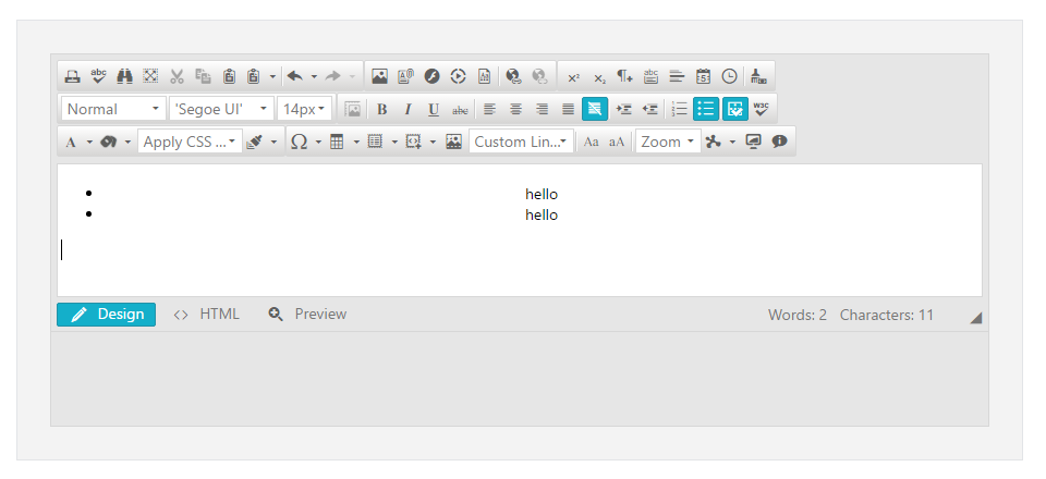 write "hello" , click enter, write hello than select all text and click on Center Alignement than click on bullets.