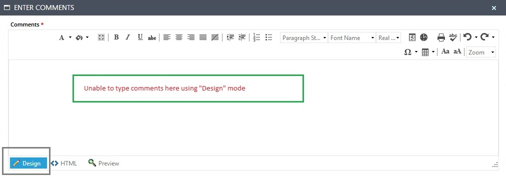Am able to enter comments using Rich Text editor for my project [at Design and HTML modes] using Firefox version prior to 62.0 but unable to enter comments in Version - 62.0 only [Especially at design mode]. Attaching screenshots for reference.