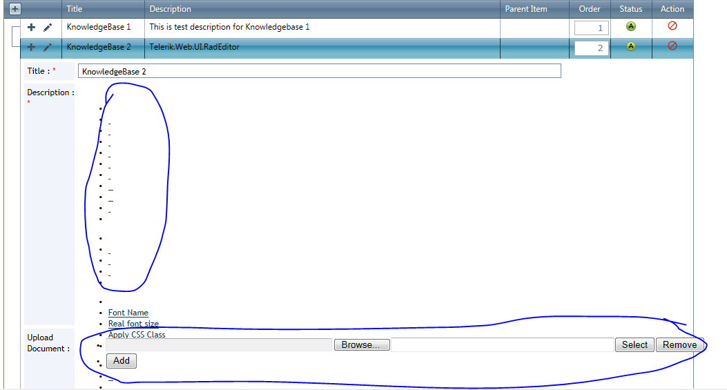 protected void Page_Load(object sender, EventArgs e) { common.CheckLogin(); if (!IsPostBack) { KnowledgeBaseRadTreeList.ExpandAllItems(); DisableReordering(); MessageLabel.Text = string.Empty; MessageLabel.Visible = false; SuccessImage.Visible = false; NoChangesImage.Visible = false; //foreach (TreeListDataItem item in KnowledgeBaseRadTreeList.Items) //{ // RadEditor KnowledgeBaseDescriptionRadEditor = (item.FindControl("KnowledgeBaseDescriptionRadEditor") as RadEditor); // KnowledgeBaseDescriptionRadEditor.EnableAjaxSkinRendering = true; // RadUpload UploadDocumentRadUpload = (item.FindControl("UploadDocumentRadUpload") as RadUpload); // UploadDocumentRadUpload.EnableAjaxSkinRendering = true; //} } }Please help !