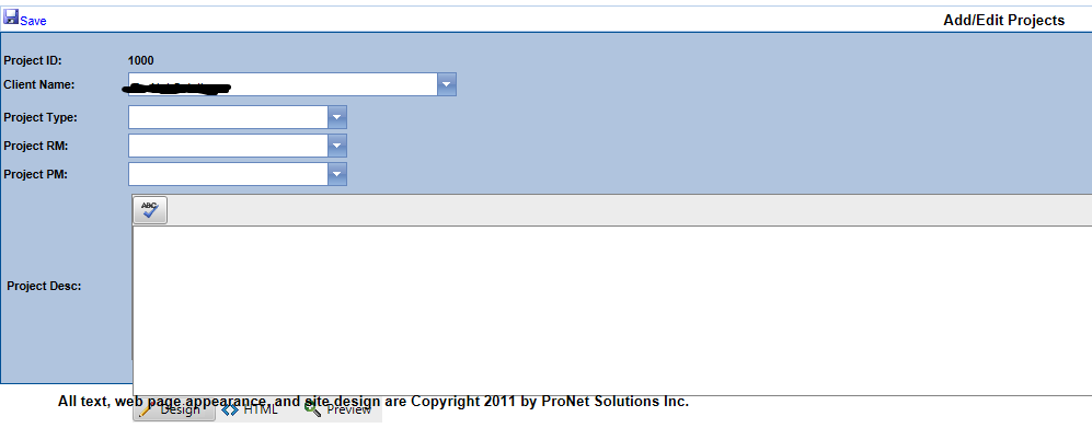 <%@ Page Title="Projects" Language="C#" MasterPageFile="~/MasterPages/Default.master" AutoEventWireup="true" CodeBehind="Projects_New.aspx.cs" Inherits="TED.Web.Projects.Projects_New" %><%@ Register Assembly="Telerik.Web.UI" Namespace="Telerik.Web.UI" TagPrefix="telerik" %><asp:Content ID="Content2" ContentPlaceHolderID="cphBody" runat="server"> <telerik:RadWindowManager ID="RadWindowManager1" runat="server" EnableShadow="true"> <Windows> <telerik:RadWindow ID="UserListDialog" runat="server" Style="z-index: 100000;" ReloadOnShow="true" AutoSize="true" ShowContentDuringLoad="false" Modal="false" /> </Windows> </telerik:RadWindowManager> <asp:ValidationSummary ID="valSummary" runat="server" ValidationGroup="valSummary" ShowMessageBox="true" ShowSummary="false" DisplayMode="BulletList" /> <div> <telerik:RadAjaxPanel ID="RadAjaxPanel1" runat="server" LoadingPanelID="RadAjaxLoadingPanel1"> <asp:Table ID="Table1" class="commandbar" runat="server" CellPadding="0" CellSpacing="1" Width="100%"> <asp:TableRow CssClass="commandbutton"> <asp:TableCell Width="10%" HorizontalAlign="Left"> <asp:LinkButton ID="lnkSave" runat="server" SkinID="LinkButton_Save" CausesValidation="True" ValidationGroup="valSummary" OnClick="lnkSave_Click"></asp:LinkButton></asp:TableCell> <asp:TableCell Width="80%" HorizontalAlign="Center"> <asp:Label ID="Label1" runat="server" SkinID="Label_Bold_10pt">Add/Edit Projects</asp:Label> </asp:TableCell> <asp:TableCell Width="10%" HorizontalAlign="Right"> <asp:LinkButton ID="LinkButton1" runat="server" SkinID="LinkButton_Cancel" CausesValidation="False" OnClick="lnkCancel_Click"></asp:LinkButton></asp:TableCell> </asp:TableRow> </asp:Table> <div class="tableAccentFullBlue"> <br /> <div class="divLabel"> <asp:Label ID="lblProjectID" runat="server" SkinID="Label_Bold_8pt" Text="Project ID:" Width="110px"></asp:Label> <asp:Label ID="projectID" runat="server" SkinID="Label_Bold_8pt"></asp:Label> </div> <div class="divLabel"> <asp:Label ID="lblClientName" runat="server" SkinID="Label_Bold_8pt" Text="Client Name:" Width="110px"></asp:Label> <telerik:RadComboBox ID="ddlClientName" runat="server" Skin="Web20" AllowCustomText="false" MarkFirstMatch="true" Width="300px"> </telerik:RadComboBox> <asp:RequiredFieldValidator ID="rfvClientName" runat="server" ControlToValidate="ddlClientName" ValidationGroup="valSummary" ErrorMessage="Client Name Required">*</asp:RequiredFieldValidator> </div> <div class="divLabel"> <asp:Button ID="btnNext" runat="server" Text="Next>>" OnClick="btnNext_Click" CausesValidation="true" ValidationGroup="valSummary" Visible="false" /> </div> <div id="divDetails" runat="server" visible="false"> <div class="divLabel"> <asp:Label ID="lblProjectType" runat="server" SkinID="Label_Bold_8pt" Text="Project Type:" Width="110px"></asp:Label> <telerik:RadComboBox ID="ddlProjectType" runat="server" Skin="Web20" AllowCustomText="false" MarkFirstMatch="true" Width="200px"> </telerik:RadComboBox> <asp:RequiredFieldValidator ID="rfvProjectType" runat="server" ControlToValidate="ddlProjectType" ValidationGroup="valSummary" ErrorMessage="Project Type Required">*</asp:RequiredFieldValidator> </div> <div class="divLabel"> <asp:Label ID="lblRM" runat="server" SkinID="Label_Bold_8pt" Text="Project RM:" Width="110px"></asp:Label> <telerik:RadComboBox ID="ddlRM" runat="server" Skin="Web20" AllowCustomText="false" MarkFirstMatch="true" Width="200px"> </telerik:RadComboBox> <asp:RequiredFieldValidator ID="rfvRM" runat="server" ControlToValidate="ddlRM" ValidationGroup="valSummary" ErrorMessage="Project RM Required">*</asp:RequiredFieldValidator> </div> <div class="divLabel"> <asp:Label ID="lblPM" runat="server" SkinID="Label_Bold_8pt" Text="Project PM:" Width="110px"></asp:Label> <telerik:RadComboBox ID="ddlPM" runat="server" Skin="Web20" AllowCustomText="false" MarkFirstMatch="true" Width="200px"> </telerik:RadComboBox> <asp:RequiredFieldValidator ID="rfvPM" runat="server" ControlToValidate="ddlPM" ValidationGroup="valSummary" ErrorMessage="Project PM Required">*</asp:RequiredFieldValidator> </div> <div class="divLabel"> <table> <tr> <td> <asp:Label ID="lblDescription" runat="server" SkinID="Label_Bold_8pt" Text="Project Desc:" Width="110px"></asp:Label> </td> <td> <telerik:RadEditor ID="txtDesc" runat="server" Width="600" Height="150px" StripFormattingOptions="All" AllowScripts="false"> <CssFiles> <telerik:EditorCssFile Value="../App_Themes/Control Themes/EditorContentArea.css" /> </CssFiles> <Tools> <telerik:EditorToolGroup> <telerik:EditorTool Name="AjaxSpellCheck" /> </telerik:EditorToolGroup> </Tools> </telerik:RadEditor> <asp:RequiredFieldValidator ID="rfvDesc" runat="server" ControlToValidate="txtDesc" ErrorMessage="Project Desc Required" ValidationGroup="valSummary">*</asp:RequiredFieldValidator> </td> </tr> </table> </div> </div> </div> </telerik:RadAjaxPanel> <telerik:RadAjaxLoadingPanel ID="RadAjaxLoadingPanel1" runat="server" BackgroundPosition="Top" EnableSkinTransparency="true" Transparency="25" Skin="Web20" /> </div></asp:Content>protected void btnNext_Click(object sender, EventArgs e) { SaveProject(); divDetails.Visible = true; btnNext.Visible = false; }