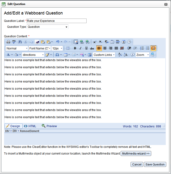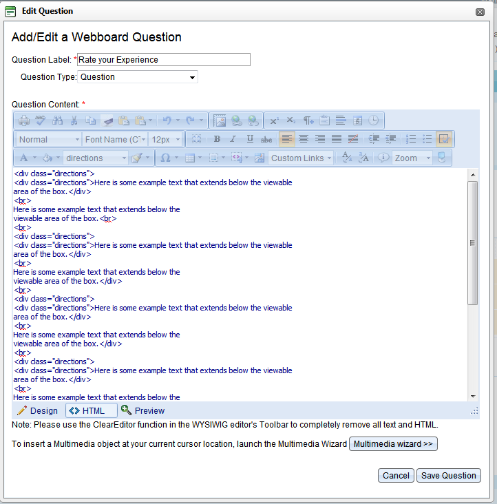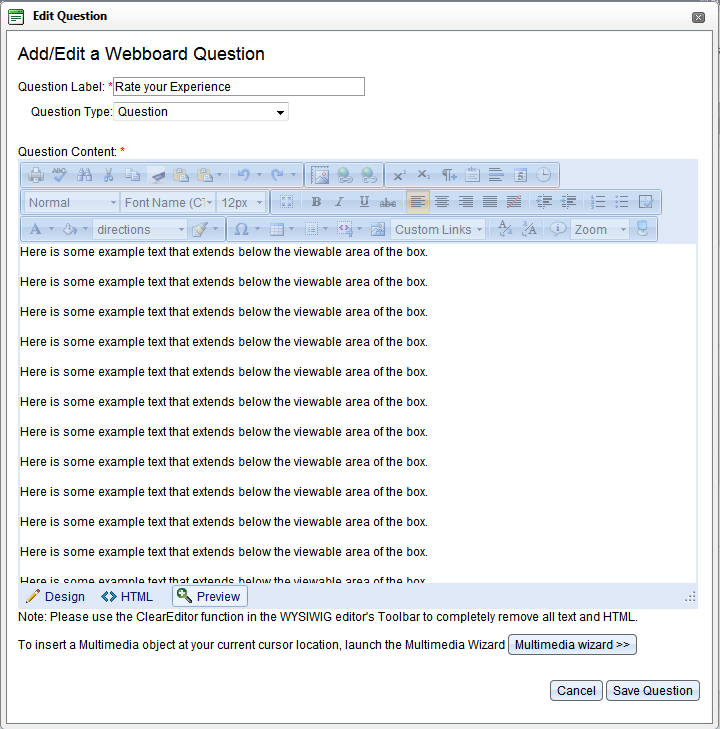 We have an application that uses a RadEditor on a RadWindow to allow our users to edit HTML content, which works perfectly in IE (versions 7 and above tested) but not Firefox (various 3.x versions tested). In IE, if the content extends beyond the viewable RadEditor content area in any of the 3 modes (Design, HTML, or Preview), a vertical scrollbar appears. In FF, if the content extends beyond the viewable RadEditor content area, a vertical scrollbar appears in HTML mode but not in Design or Preview mode. Any thoughts on why this might happen and how to correct it? Please see the attached images to see the different views in FF and how they appear versus the screenshot of the same popup window in IE.