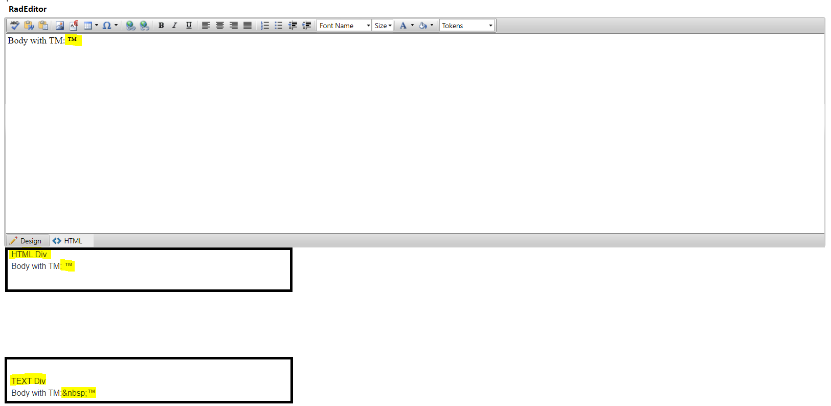 We are using RadEditor to let user compose and send emails. On adding TM symbol, it all works fine within RadEditor but when we send email, TM is not displayed in Outlook.