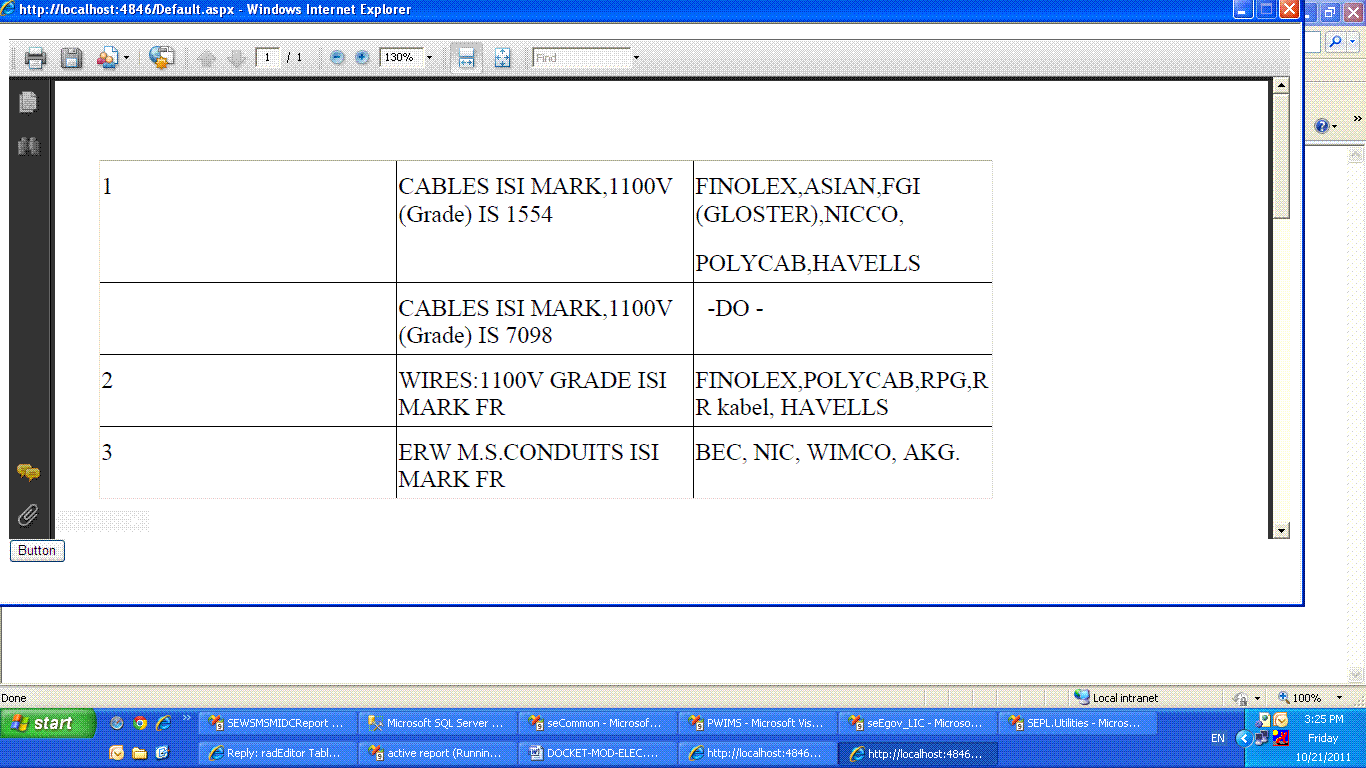 <table style="border: currentcolor; width: 607px; border-collapse: collapse;" border="1" cellspacing="0" cellpadding="0"> <colgroup><col style="width:20px;"></col><col></col><col></col></colgroup> <tbody> <tr style="height: 35.5pt;"> <td style="border: 1px solid currentcolor; background-color: transparent;"> <p><span style="font-size: 11pt;">1</span></p> </td> <td style="border: 1px solid currentcolor; background-color: transparent;"> <p><span style="font-size: 11pt;">CABLES ISI MARK,1100V(Grade) IS 1554</span></p> </td> <td style="border: 1px solid currentcolor; background-color: transparent;"> <p><span style="font-size: 11pt;">FINOLEX,ASIAN,FGI(GLOSTER),NICCO,</span></p> <p><span style="font-size: 11pt;">POLYCAB,HAVELLS</span></p> </td> </tr> <tr> <td style="border: 1px solid currentcolor; background-color: transparent;"> <p> </p> </td> <td style="border: 1px solid currentcolor; background-color: transparent;"> <p><span style="font-size: 11pt;">CABLES ISI MARK,1100V(Grade) IS 7098</span></p> </td> <td style="border: 1px solid currentcolor; background-color: transparent;"> <p><span style="font-size: 11pt;"> -DO -</span></p> </td> </tr> <tr> <td style="border: 1px solid currentcolor; background-color: transparent;"> <p><span style="font-size: 11pt;">2</span></p> </td> <td style="border: 1px solid currentcolor; background-color: transparent;"> <p><span style="font-size: 11pt;">WIRES:1100V GRADE ISI MARK FR</span></p> </td> <td style="border: 1px solid currentcolor; background-color: transparent;"> <p><span style="font-size: 11pt;">FINOLEX,POLYCAB,RPG,RR kabel, HAVELLS</span></p> </td> </tr> <tr> <td style="border: 1px solid currentcolor; background-color: transparent;"> <p><span style="font-size: 11pt;">3</span></p> </td> <td style="border: 1px solid currentcolor; background-color: transparent;"> <p><span style="font-size: 11pt;">ERW M.S.CONDUITS ISI MARK FR</span></p> </td> <td style="border: 1px solid currentcolor; background-color: transparent;"> <p><span style="font-size: 11pt;">BEC, NIC, WIMCO, AKG.</span></p> </td> </tr> </tbody></table>Best wishes,