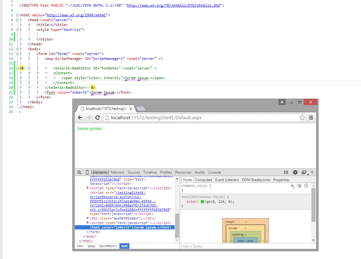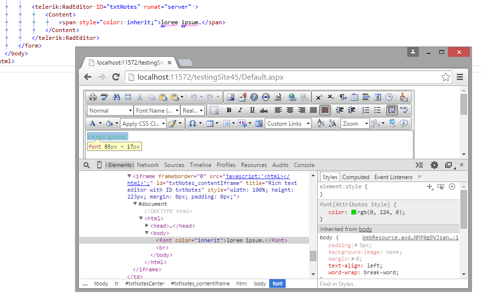 Hello guys,I have a problem with a text color in radEditor. Setting an html to radEditor content on code behind, on UI a part of the text appears in color green despite the fact that no green color is reffered in style, there is only "color:inherit" for a span.