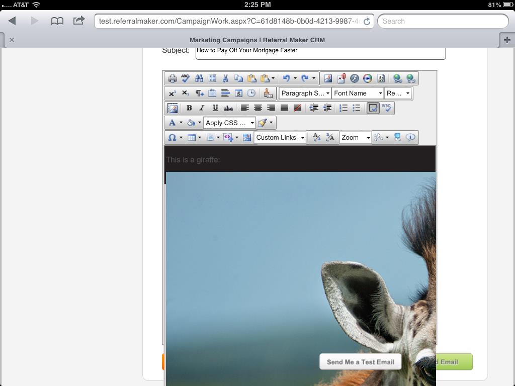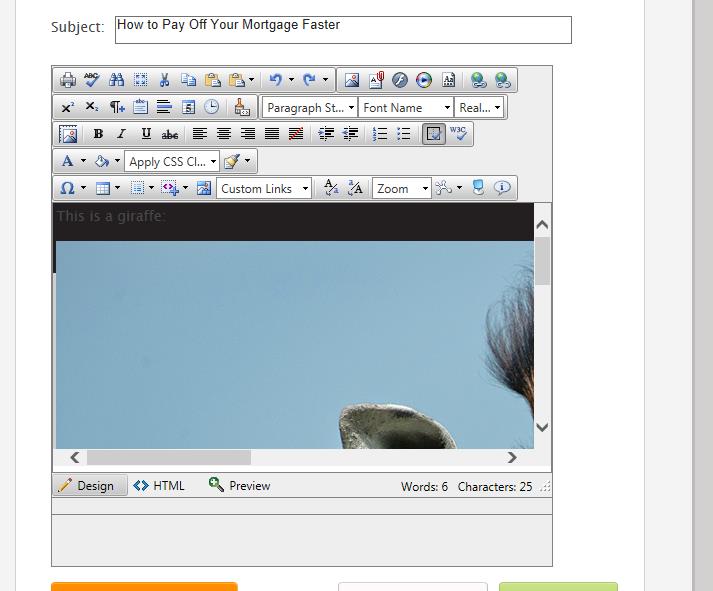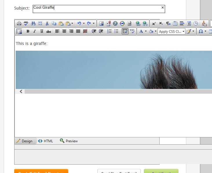 Doing this on a PC, it works the way I'd expect (see attached giraffeiframepc.jpg). However, on an iPad, the image runs off the bottom, covering the buttons (giraffeiframeipad.jpg). Looking around, I heard people say that iPads have an issue with Rich Text Editors and iFrames, so I tried adding the "ContentAreaMode="Div"" parameter. But when I do that, the image runs off to the right (giraffediv.jpg). I also tried setting the EditorCssFile to an empty .css file in case it was pulling in a strange style from somewhere else.