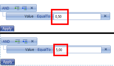 But if I change my culture to german (de-DE), Radfilter textbox is accepting value as 0,5 (which is correct) and my grid column also filtered with 0,5 values, but radfilter textbox converting 0,5 value as 5,00 which is not correct. It should show as 0,5.
