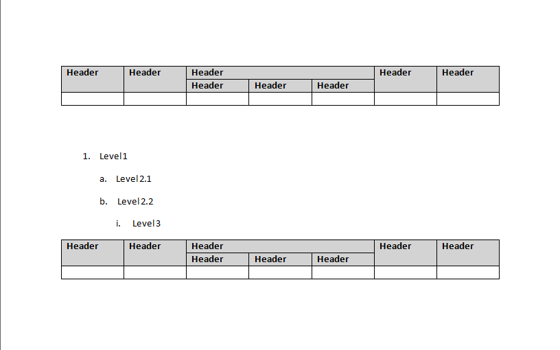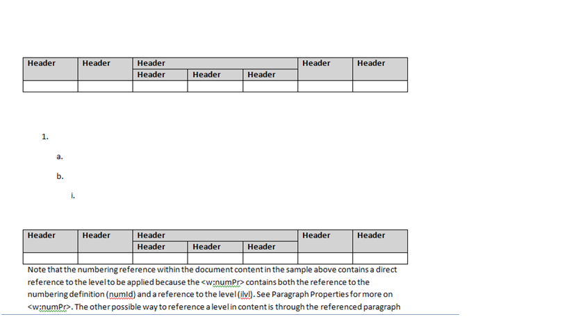 001.private void button1_Click(object sender, EventArgs e)002. {003. RadFlowDocument document = new RadFlowDocument();004. //Section section = document.Sections.AddSection(); 005. 006. DocxFormatProvider provider = new DocxFormatProvider();007. RadFlowDocumentEditor editor = new RadFlowDocumentEditor(document);008. 009. string reportFilePathDir = Path.Combine(Path.GetFullPath(Path.Combine(Directory.GetCurrentDirectory(), @"..\..\..\")), "OutputTes", "listandtable.docx");010. // Start to Generate Monber Doc011. using (Stream output = new FileStream(reportFilePathDir, FileMode.OpenOrCreate))012. {013. //1. Table014. GenTableInDoc(document, editor);015. 016. 017. //2. list018. List list = document.Lists.Add(ListTemplateType.NumberedDefault);019. 020. var paragraphTop = editor.InsertParagraph();021. paragraphTop.Inlines.AddRun("Note that the numbering the paragraph.");022. 023. var paragraphTop1 = editor.InsertParagraph();024. paragraphTop1.Inlines.AddRun("okeh <p color=\"red\">this is red color</p> <font color=\"red\">This is some text!</font>");025. 026. 027. var paragraph1 = editor.InsertParagraph();028. paragraph1.Inlines.AddRun("Note that the numbering the paragraph.");029. paragraph1.ListId = list.Id;030. paragraph1.ListLevel = 0;031. 032. var paragraph2 = editor.InsertParagraph();033. paragraph2.Inlines.AddRun("Note that the numbering the paragraph.");034. paragraph2.ListId = list.Id;035. paragraph2.ListLevel = 1;036. 037. var paragraph3 = editor.InsertParagraph();038. paragraph3.Inlines.AddRun("Note that the numbering the paragraph.");039. paragraph3.ListId = list.Id;040. paragraph3.ListLevel = 1;041. 042. var paragraph4 = editor.InsertParagraph();043. paragraph4.Inlines.AddRun("Note that the numbering the paragraph.");044. paragraph4.ListId = list.Id;045. paragraph4.ListLevel = 2;046. 047. var paragraphBottom = editor.InsertParagraph();048. paragraphBottom.Inlines.AddRun("Note that the numbering the paragraph.");049. 050. 051. //3. Table052. GenTableInDoc(document, editor);053. 054. //*EXPORT TO WORD055. provider.Export(document, output);056. }057. 058. MessageBox.Show(this, "ok");059. }060. 061. 062.public static void GenTableInDoc(RadFlowDocument document, RadFlowDocumentEditor editor)063. {064. Style style = new Style("ok", StyleType.Table);065. style.CharacterProperties.ForegroundColor.LocalValue = new ThemableColor(System.Windows.Media.Colors.Black);066. style.CharacterProperties.FontWeight.LocalValue = FontWeights.Bold;067. style.CharacterProperties.FontSize.LocalValue = 9;068. 069. document.StyleRepository.Add(style);070. 071. var section = document.Sections.AddSection();072. 073. Table table = editor.InsertTable();074. //Table table = section.Blocks.AddTable();075. table.PreferredWidth = new TableWidthUnit(TableWidthUnitType.Percent, 100);076. 077. document.StyleRepository.AddBuiltInStyle(BuiltInStyleNames.TableGridStyleId);078. table.StyleId = BuiltInStyleNames.TableGridStyleId;079. 080. //header081. TableRow rowHeader = table.Rows.AddTableRow();082. rowHeader.RepeatOnEveryPage = true;083. 084. //number cell header085. TableCell cellNumberHeader = rowHeader.Cells.AddTableCell();086. cellNumberHeader.Blocks.AddParagraph().Inlines.AddRun("Header").FontWeight = FontWeights.Bold; cellNumberHeader.Shading.BackgroundColor = new ThemableColor(System.Windows.Media.Colors.LightGray);087. cellNumberHeader.RowSpan = 2; cellNumberHeader.ColumnSpan = 1;088. 089. cellNumberHeader = rowHeader.Cells.AddTableCell();090. cellNumberHeader.Blocks.AddParagraph().Inlines.AddRun("Header").FontWeight = FontWeights.Bold; cellNumberHeader.Shading.BackgroundColor = new ThemableColor(System.Windows.Media.Colors.LightGray);091. cellNumberHeader.RowSpan = 2; cellNumberHeader.ColumnSpan = 1;092. 093. cellNumberHeader = rowHeader.Cells.AddTableCell();094. cellNumberHeader.Blocks.AddParagraph().Inlines.AddRun("Header").FontWeight = FontWeights.Bold; cellNumberHeader.Shading.BackgroundColor = new ThemableColor(System.Windows.Media.Colors.LightGray);095. cellNumberHeader.RowSpan = 1; cellNumberHeader.ColumnSpan = 3;096. 097. cellNumberHeader = rowHeader.Cells.AddTableCell();098. cellNumberHeader.Blocks.AddParagraph().Inlines.AddRun("Header").FontWeight = FontWeights.Bold; cellNumberHeader.Shading.BackgroundColor = new ThemableColor(System.Windows.Media.Colors.LightGray);099. cellNumberHeader.RowSpan = 2; cellNumberHeader.ColumnSpan = 1;100. 101. cellNumberHeader = rowHeader.Cells.AddTableCell();102. cellNumberHeader.Blocks.AddParagraph().Inlines.AddRun("Header").FontWeight = FontWeights.Bold; cellNumberHeader.Shading.BackgroundColor = new ThemableColor(System.Windows.Media.Colors.LightGray);103. cellNumberHeader.RowSpan = 2; cellNumberHeader.ColumnSpan = 1;104. 105. TableRow rowHeader1 = table.Rows.AddTableRow();106. rowHeader1.RepeatOnEveryPage = true;107. 108. TableCell c1 = rowHeader1.Cells.AddTableCell();109. c1.Blocks.AddParagraph().Inlines.AddRun("Header").FontWeight = FontWeights.Bold; c1.Shading.BackgroundColor = new ThemableColor(System.Windows.Media.Colors.LightGray);110. c1 = rowHeader1.Cells.AddTableCell();111. c1.Blocks.AddParagraph().Inlines.AddRun("Header").FontWeight = FontWeights.Bold; c1.Shading.BackgroundColor = new ThemableColor(System.Windows.Media.Colors.LightGray);112. c1 = rowHeader1.Cells.AddTableCell();113. c1.Blocks.AddParagraph().Inlines.AddRun("Header").FontWeight = FontWeights.Bold; c1.Shading.BackgroundColor = new ThemableColor(System.Windows.Media.Colors.LightGray);114. 115. TableRow rowHeader2 = table.Rows.AddTableRow();116. TableCell c2 = rowHeader2.Cells.AddTableCell();117. c2.Blocks.AddParagraph().Inlines.AddRun("");118. c2 = rowHeader2.Cells.AddTableCell();119. c2.Blocks.AddParagraph().Inlines.AddRun("");120. c2 = rowHeader2.Cells.AddTableCell();121. c2.Blocks.AddParagraph().Inlines.AddRun("");122. c2 = rowHeader2.Cells.AddTableCell();123. c2.Blocks.AddParagraph().Inlines.AddRun("");124. c2 = rowHeader2.Cells.AddTableCell();125. c2.Blocks.AddParagraph().Inlines.AddRun("")