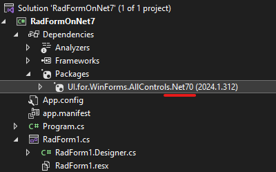 When I open the project I notice that the project is targeting .net 7 while the NuGet package is targeting .Net 6. Keep in mind that it is recommended to use our UI.for.WinForms.AllControls.Net70 for projects targeting .Net7 or .Net 8. To test this, I have removed the referenced NuGet from the project and added the UI.for.WinForms.AllControls.Net70 NuGet with its latest version.
