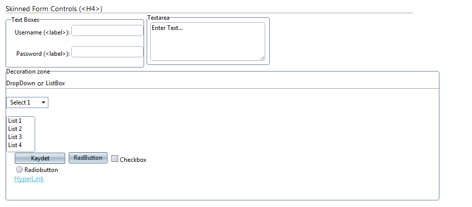 In master page I put a skinmanager and formdecorator elements and set my custom skin. I used both of them because If I use only formdecorator asp controls affected from skin not telerik controls, or If I use only skinmanager, telerik controls affected from skin not asp controls. So I used all of them.