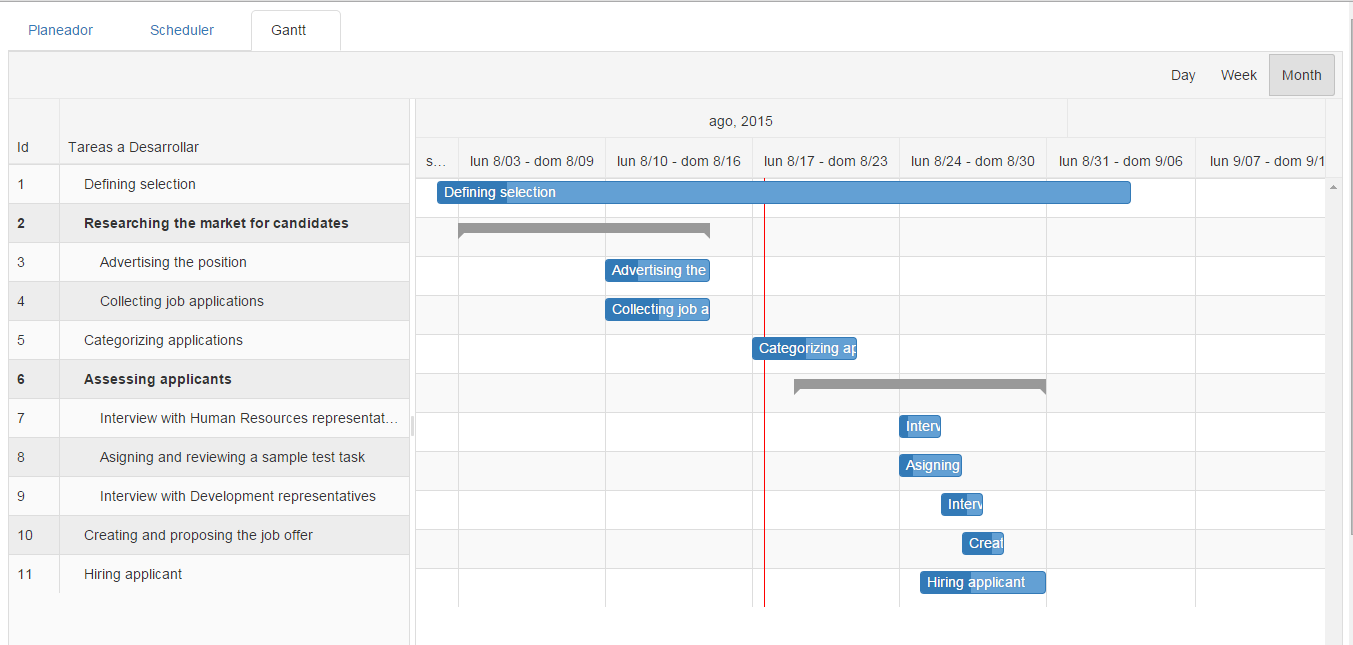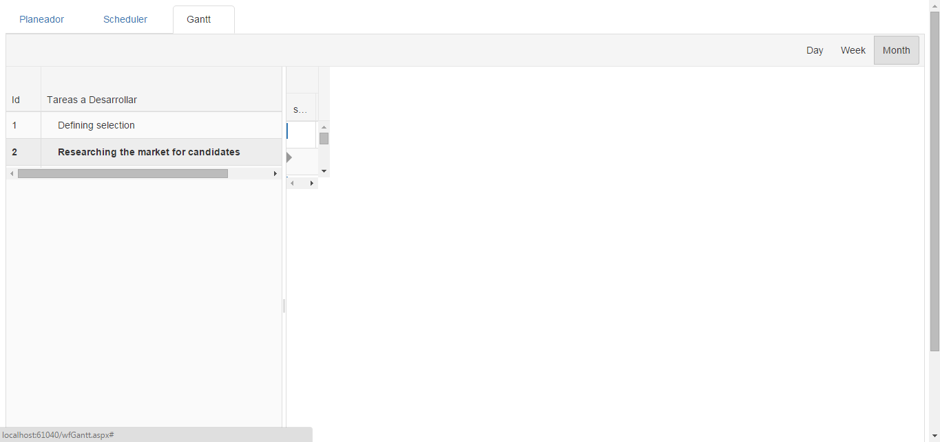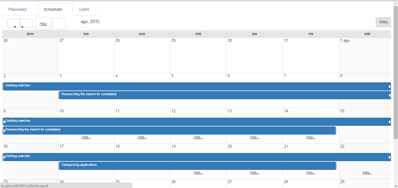 protected void Page_Load(object sender, EventArgs e){ RadTabStrip1.Skin = "Bootstrap"; DataTable tasks = new DataTable(); tasks.Columns.Add(new DataColumn("ID", typeof(int))); tasks.Columns.Add(new DataColumn("ParentID", typeof(int))); tasks.Columns.Add(new DataColumn("Subject", typeof(string))); tasks.Columns.Add(new DataColumn("Summary", typeof(bool))); tasks.Columns.Add(new DataColumn("PercentComplete", typeof(decimal))); tasks.Columns.Add(new DataColumn("Start", typeof(DateTime))); tasks.Columns.Add(new DataColumn("End", typeof(DateTime))); tasks.Rows.Add(1, null, "Defining selection", false, 0.1, new DateTime(2015, 8, 2), new DateTime(2015, 9, 4)); tasks.Rows.Add(2, null, "Researching the market for candidates", true, 0, new DateTime(2015, 8, 3), new DateTime(2015, 8, 15)); tasks.Rows.Add(3, 2, "Advertising the position", false, 0.3, new DateTime(2015, 8, 10), new DateTime(2015, 8, 15)); tasks.Rows.Add(4, 2, "Collecting job applications", false, 0.5, new DateTime(2015, 8, 10), new DateTime(2015, 8, 15)); tasks.Rows.Add(5, null, "Categorizing applications", false, 0.5, new DateTime(2015, 8, 17), new DateTime(2015, 8, 22)); tasks.Rows.Add(6, null, "Assessing applicants", true, 0, new DateTime(2015, 8, 19), new DateTime(2015, 8, 31)); tasks.Rows.Add(7, 6, "Interview with Human Resources representatives", false, 0.2, new DateTime(2015, 8, 24), new DateTime(2015, 8, 26)); tasks.Rows.Add(8, 6, "Asigning and reviewing a sample test task", false, 0.2, new DateTime(2015, 8, 24), new DateTime(2015, 8, 27)); tasks.Rows.Add(9, 6, "Interview with Development representatives", false, 0.6, new DateTime(2015, 8, 26), new DateTime(2015, 8, 28)); tasks.Rows.Add(10, null, "Creating and proposing the job offer", false, 0.7, new DateTime(2015, 8, 27), new DateTime(2015, 8, 29)); tasks.Rows.Add(11, null, "Hiring applicant", false, 0.4, new DateTime(2015, 8, 25), new DateTime(2015, 8, 31)); //Scheduler rschCasos.ReadOnly = true; rschCasos.DataSource = tasks; rschCasos.DataKeyField = "ID"; rschCasos.DataSubjectField = "Subject"; rschCasos.DataStartField = "Start"; rschCasos.DataEndField = "End"; rschCasos.Skin = "Bootstrap"; rschCasos.DataBind(); //Gant CargarGraficoGantt(tasks); //RadTabStrip1.Tabs[0].Selected = true; //RadMultiPage1.SelectedIndex = pvPlanner.Index;}private void CargarGraficoGantt(DataTable dsGrafico){ RadGantt rgGantt = new RadGantt(); rgGantt.ID = "GraficoGantt"; rgGantt.SnapToGrid = false; rgGantt.ReadOnly = true; rgGantt.AllowSorting = false; rgGantt.SelectedView = GanttViewType.MonthView; rgGantt.AutoGenerateColumns = false; //rgGantt.Width = Unit.Percentage(100.0); //rgGantt.Height = Unit.Percentage(100.0); //Columnas agregarColumna("ID", "Id", 50, rgGantt); agregarColumna("Title", "Tareas a Desarrollar", 350, rgGantt); agregarColumna("PercentComplete", "Porcentaje", 80, rgGantt); rgGantt.DataBindings.TasksDataBindings.IdField = "ID"; rgGantt.DataBindings.TasksDataBindings.TitleField = "Subject"; rgGantt.DataBindings.TasksDataBindings.StartField = "Start"; rgGantt.DataBindings.TasksDataBindings.EndField = "End"; rgGantt.DataBindings.TasksDataBindings.ParentIdField = "ParentID"; rgGantt.DataBindings.TasksDataBindings.SummaryField = "summary"; rgGantt.DataBindings.TasksDataBindings.PercentCompleteField = "PercentComplete"; rgGantt.DataSource = dsGrafico; rgGantt.Skin = "Bootstrap"; rgGantt.DataBind(); pvGantt.Controls.Add(rgGantt);}private void agregarColumna(string DataField, string Header, int tamano, RadGantt ctrlGantt){ GanttBoundColumn gbc = new GanttBoundColumn(); gbc.DataField = DataField; gbc.HeaderText = Header; gbc.Width = Unit.Pixel(tamano); ctrlGantt.Columns.Add(gbc);}So when I activate this: