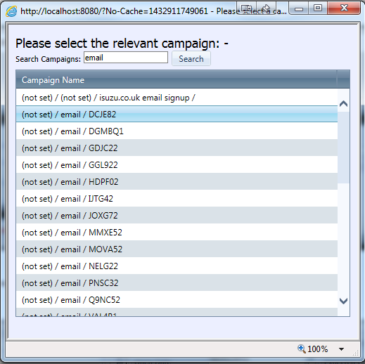 <div style="horiz-align: center"> <span style="text-align: center; font-size: large; padding-bottom: 15px;">Please select the relevant campaign: -</span> <div style="padding-bottom: 5px;">Search Campaigns: <asp:TextBox ID="CampaignFilter" AutoPostBack="true" runat="server"/><span style="padding-left: 5px;"><asp:button runat="server" Text="Search" id="SearchButton" OnClick="SearchButtonOnClick" /></span></div> <telerik:RadGrid ID="CampaignGrid" runat="server" OnNeedDataSource="CampaignGridNeedDataSource" AllowPaging="False" Skin="WebBlue" Height="350px"> <ClientSettings EnableRowHoverStyle="True" Scrolling-UseStaticHeaders="True" Scrolling-AllowScroll="True"> <ClientEvents OnRowClick="CampaignRowClicked" /> </ClientSettings> <MasterTableView AutoGenerateColumns="False" AllowSorting="False" AllowFilteringByColumn="False" TableLayout="Fixed"> <Columns> <telerik:GridTemplateColumn DataField="Name" SortExpression="Name" HeaderText="Campaign Name" UniqueName="Name"> <ItemTemplate> <div class="TableCellNoOverflow" id="CampaignName"><%# Eval("Name") %></div> <asp:HiddenField runat="server" ID="HdnCampaignId" Value='<%# Eval("Id") %>'/> </ItemTemplate> </telerik:GridTemplateColumn> </Columns> </MasterTableView> </telerik:RadGrid> </div>